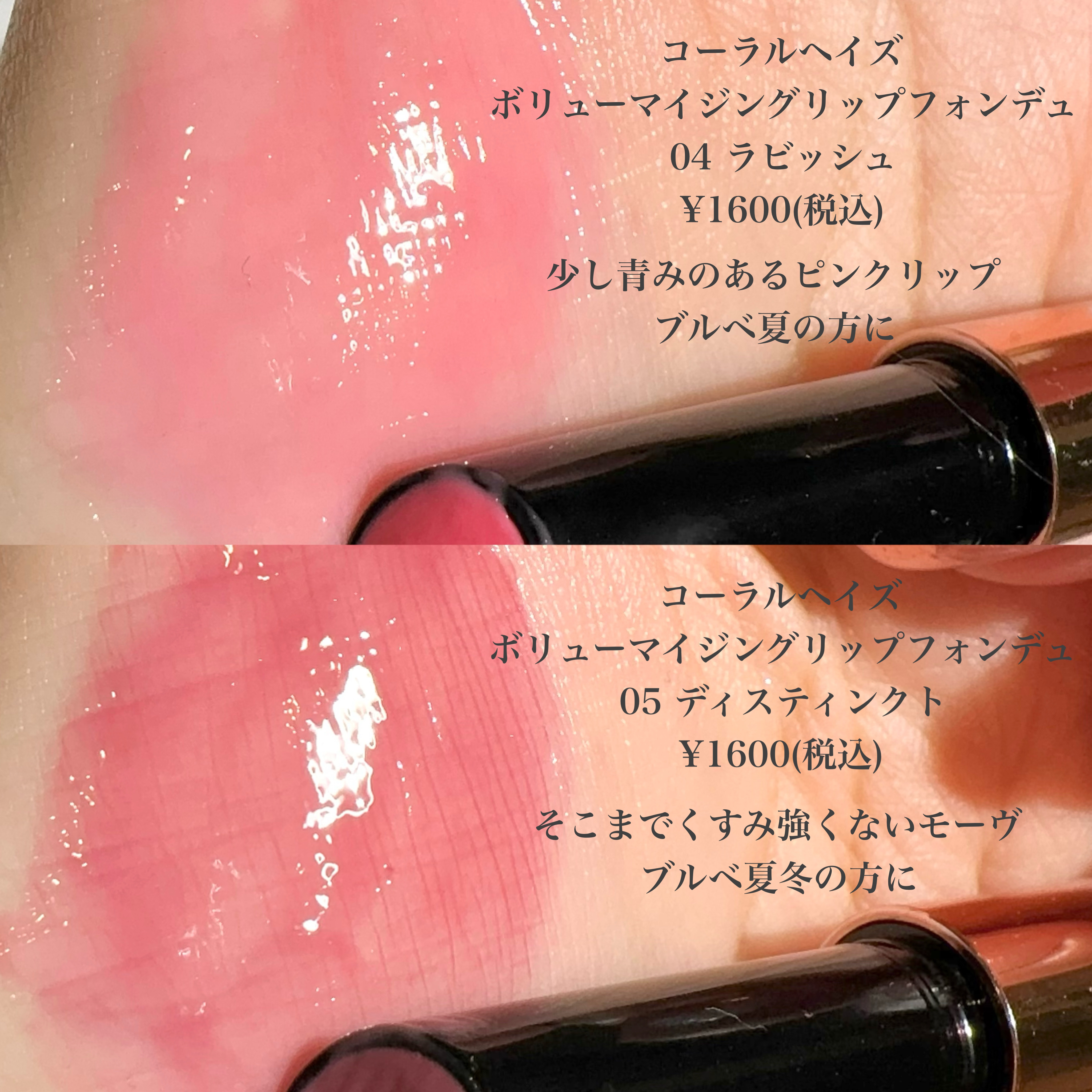ねっちょりボリューム感あるテクスチャーだけど、ベタつきなく使いやすい。 ティントじゃない普通のグロスだから色もちは良くない。 発色ナチュラルだからこれだけでもいいけど、他のリップと合わせても可愛い!!