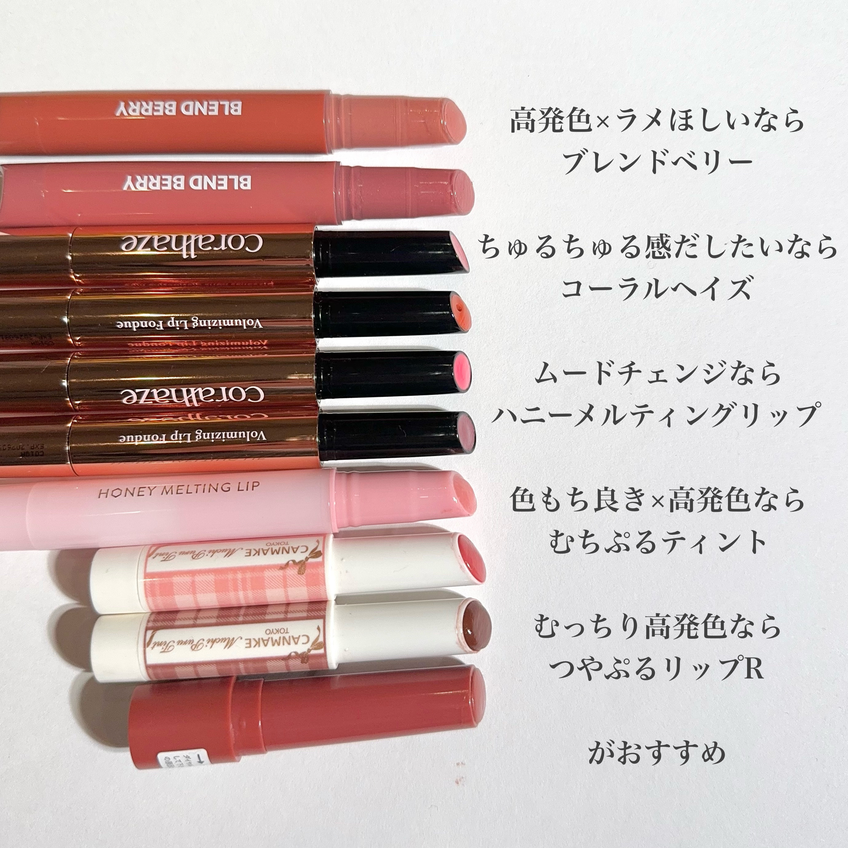 カチカチうるつやリップ集めました♡BLENDBERRYリップバルーン006ふいうちオレンジネイチャーリパブリックハニーメルティングリップ04ザクロサワーdasiqueメルティングキャンディーバーム02アップルシナモンうるつやリップ大好き♡似た...