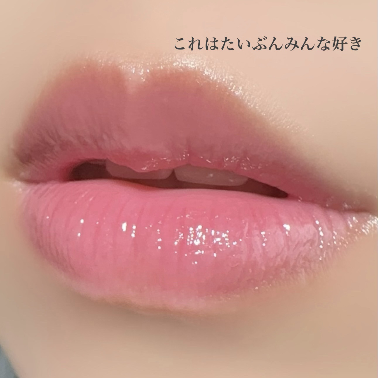 ねっちょりボリューム感あるテクスチャーだけど、ベタつきなく使いやすい。 ティントじゃない普通のグロスだから色もちは良くない。 発色ナチュラルだからこれだけでもいいけど、他のリップと合わせても可愛い!!