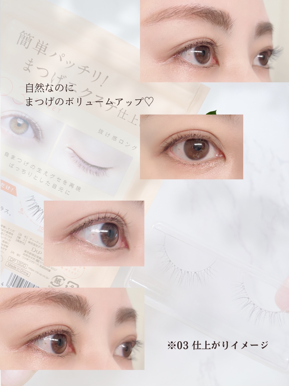 一気にアイドルのような目元になってびっくり…! 馴染みがいいから付けてます感がなくて、近くで見ても超自然なサロン級の仕上がり👀✨ ウォータープルーフのノリを塗って数十秒乾かすだけだからサクッと装着できるし、取り外しも簡単! ❤︎03は束感まつ毛が好きな方や上品に盛りたい方に ❤︎05は遠目から見てもぱっちりなあざと可愛い目元を演出したい方に