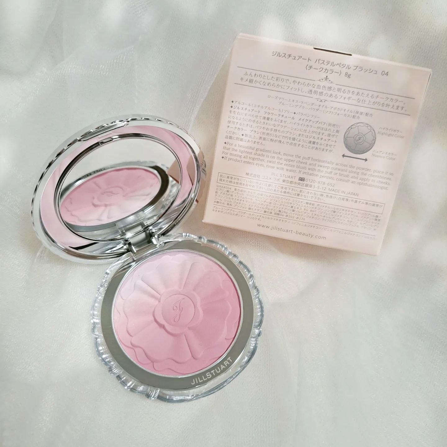 【使った商品】ジルスチュアートパステルペタルブラッシュ【商品の特徴】カラーは04dressedpeony自然に頬の毛穴や凹凸を光でぼかしてフィルターをかけたような肌に仕上げてくれるアイテムミラー付き香りはクリスタルフローラルブーケの香り【使い...
