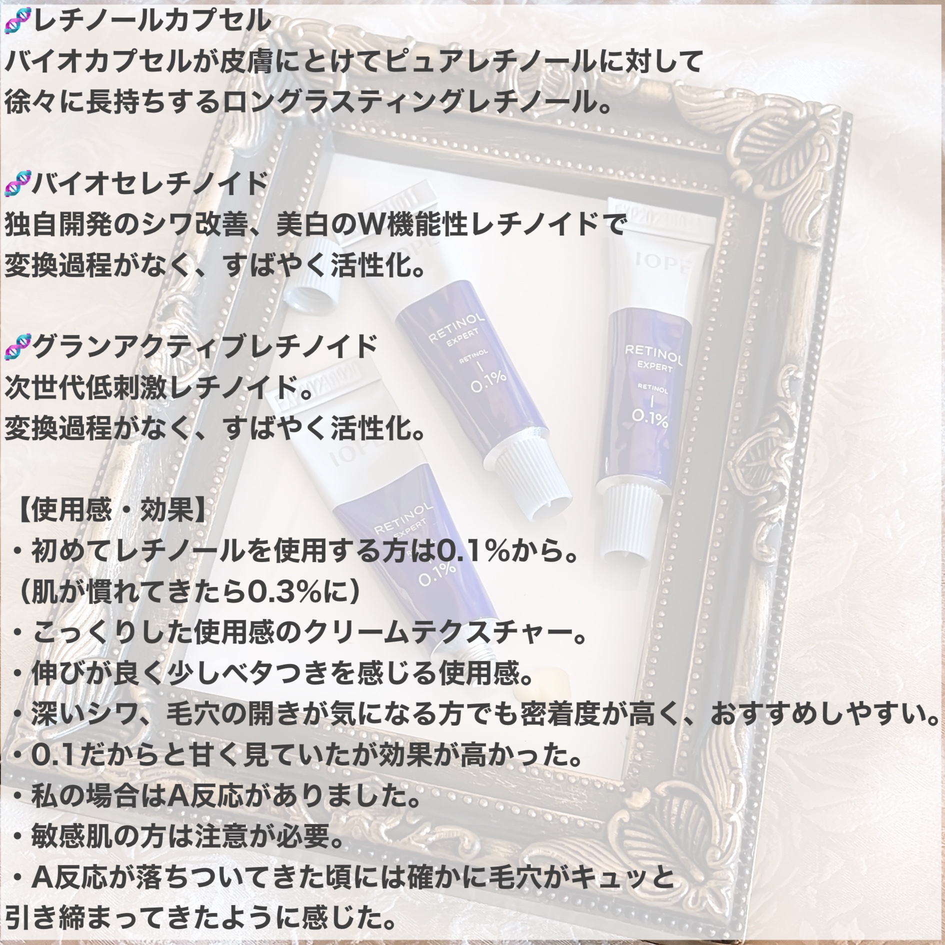 【使った商品】IOPEレチノールエキスパート0.1%サンプル【商品の特徴】シワ・毛穴悩みに安定化したレチノール0.1%配合で毛穴をケアし、シワ悩みにも。目もと、眉間、目の下、首、おでこ、ほうれい線口もとのシワに✼••┈┈••✼••┈┈••✼•...