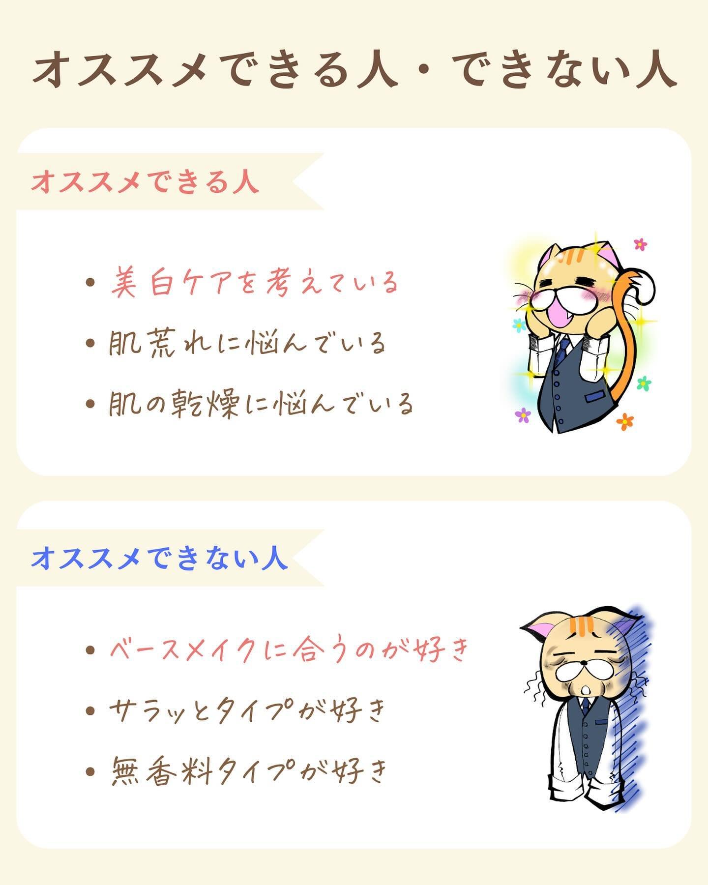 腕に塗布してから30分経過した肌水分量の平均増加率は+87%と優秀すぎる保湿力 サラッとした仕上がり DPG配合 美白有効成分のホワイトトラネキサム酸や、追加された肌荒れ防止有効成分のアラントインが配合 ぬるぬる感は強め 少ししっとりした仕上がりでしっとりタイプの乳液を塗ったような保湿力 有効成分のナイアシンアミドが配合 うるおい成分として3種類のヒアルロン酸が配合