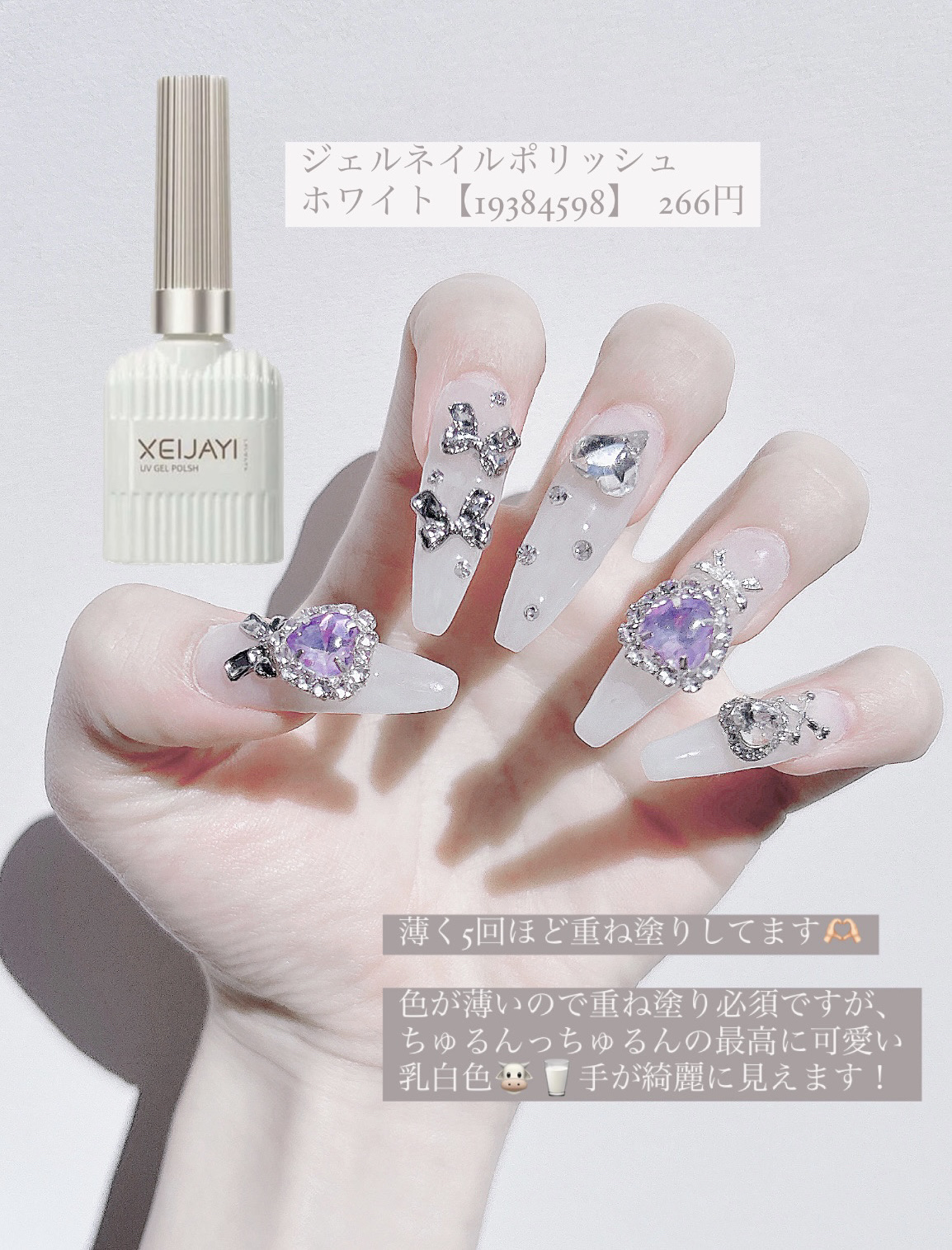 SHEINで作るワンホンネイル✐カラージェル乳白色商品ID19384598パーツがカラフルなのでピンク系ではなくシンプルな乳白色を2度塗りしてます。ベース,トップはSHEINのものでもセリア等のものでも大丈夫です!私はセリアのベースとトップを...