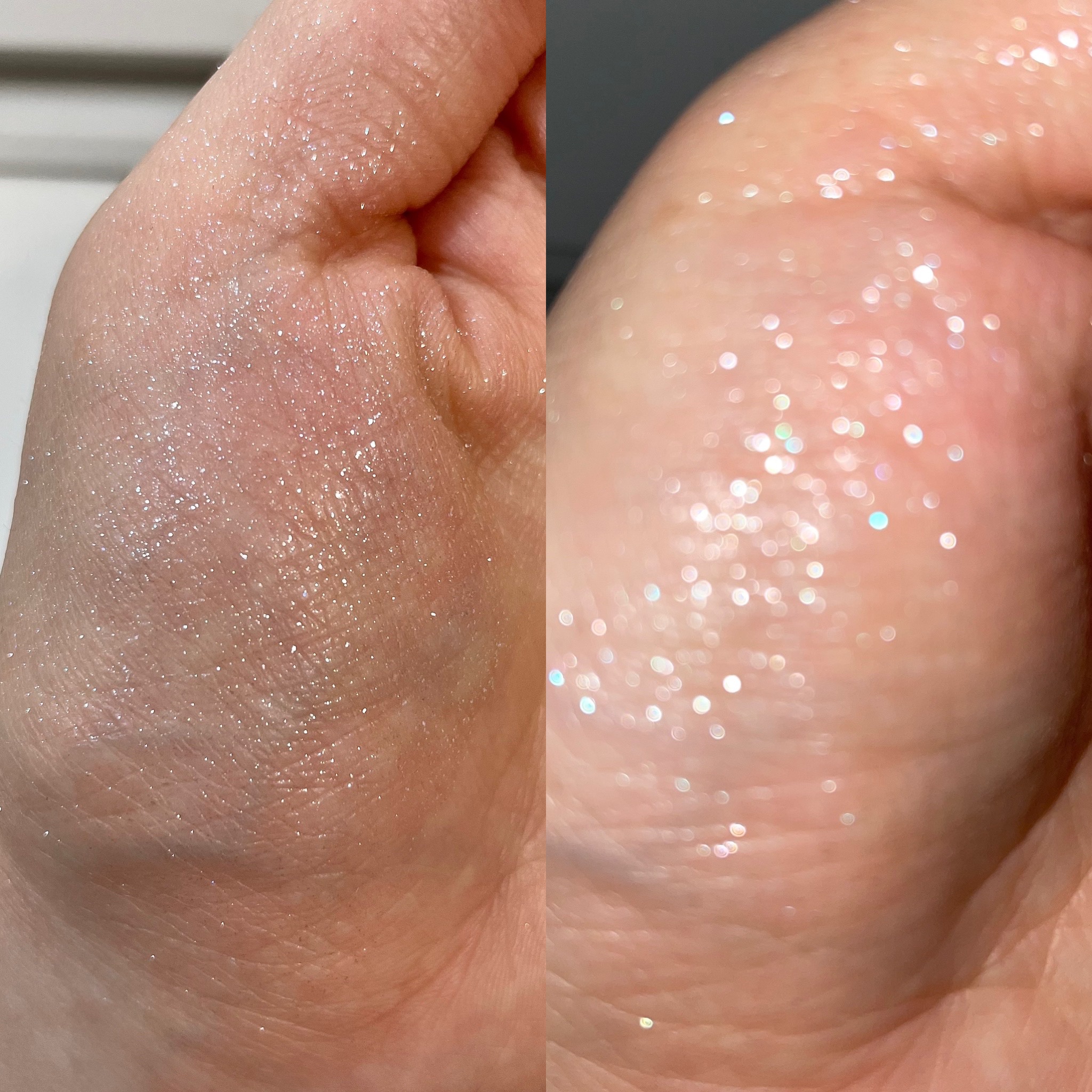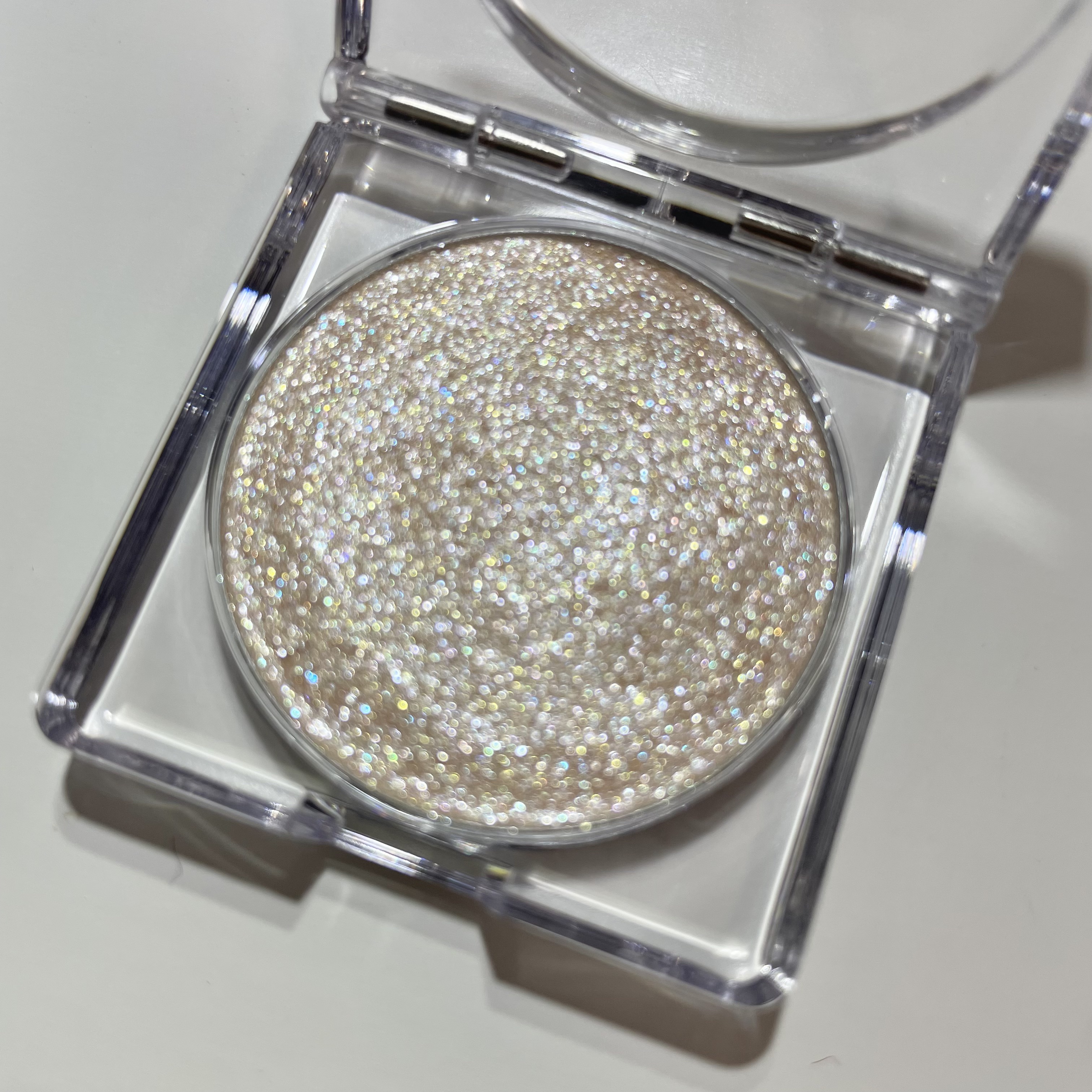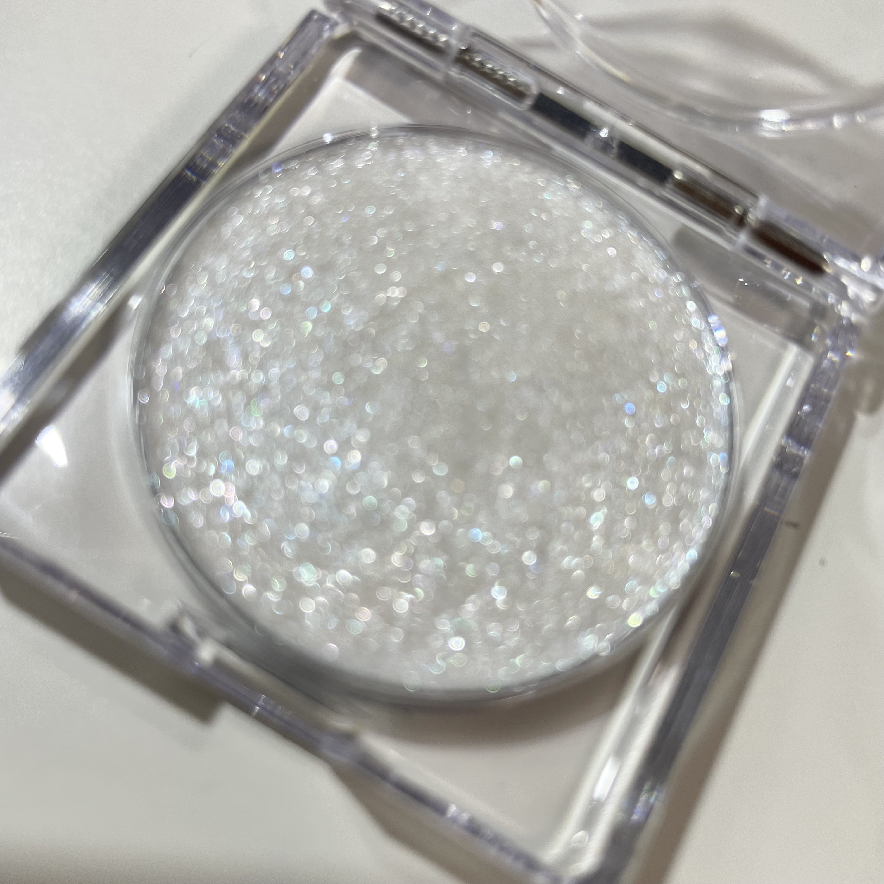 大粒のシルバーとブルーのラメがたっぷりのキラキラのハイライト。粉飛びしにくくピタッと密着し、存在感のある華やかな印象に アイシャドウの上にトッピングしたり、涙袋メイクにもおすすめ! ブルベ冬にイチオシ❄️