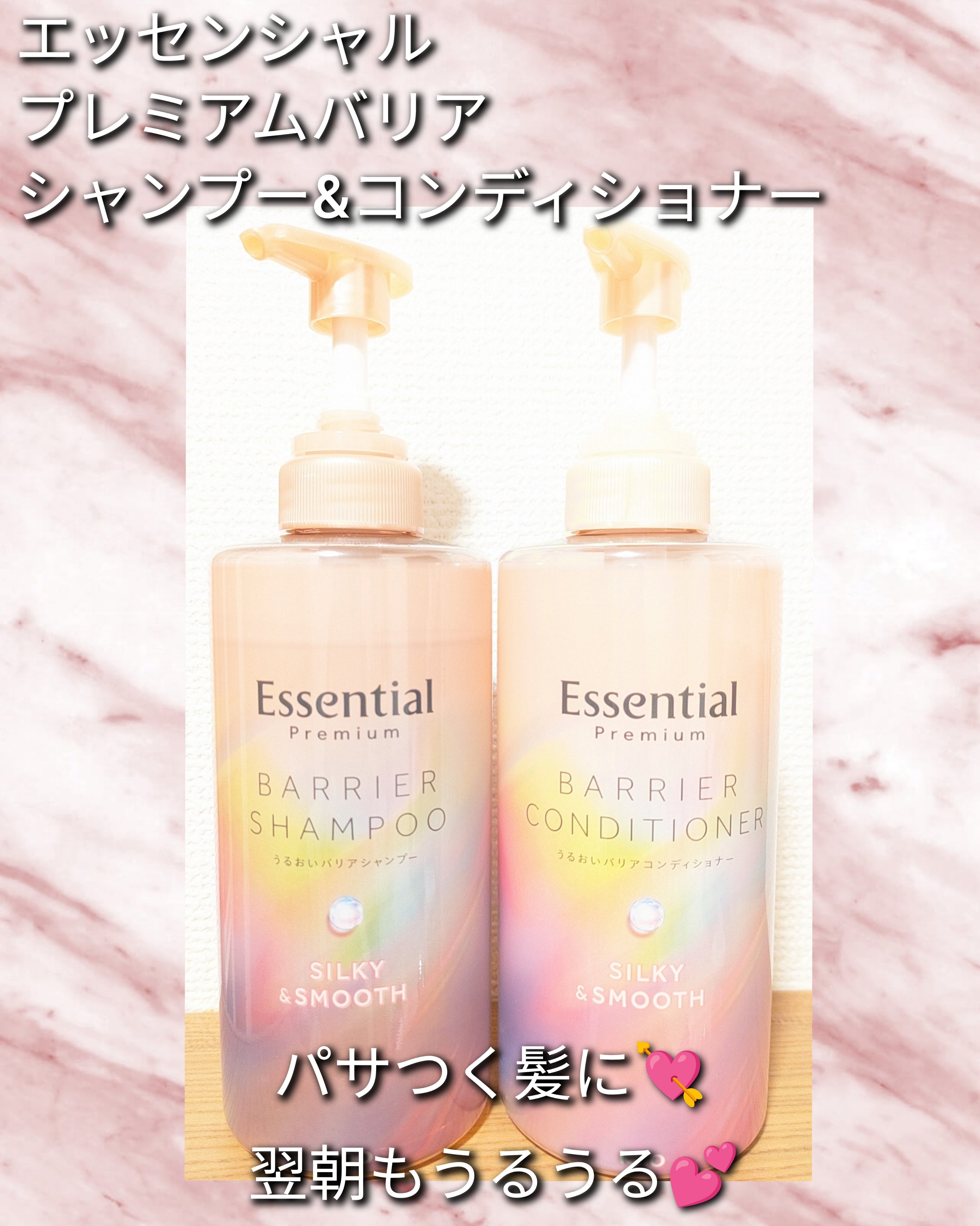 ♡エッセンシャル♡エッセンシャルプレミアムバリアシャンプー・コンディショナーシルキー&スムースシャンプーはふわふわ泡立ちが良く、全体的にピーチの香りに包まれとても幸せな気分になりました🍑コンディショナーをすると指通りがつるんと全体的なまとまり...
