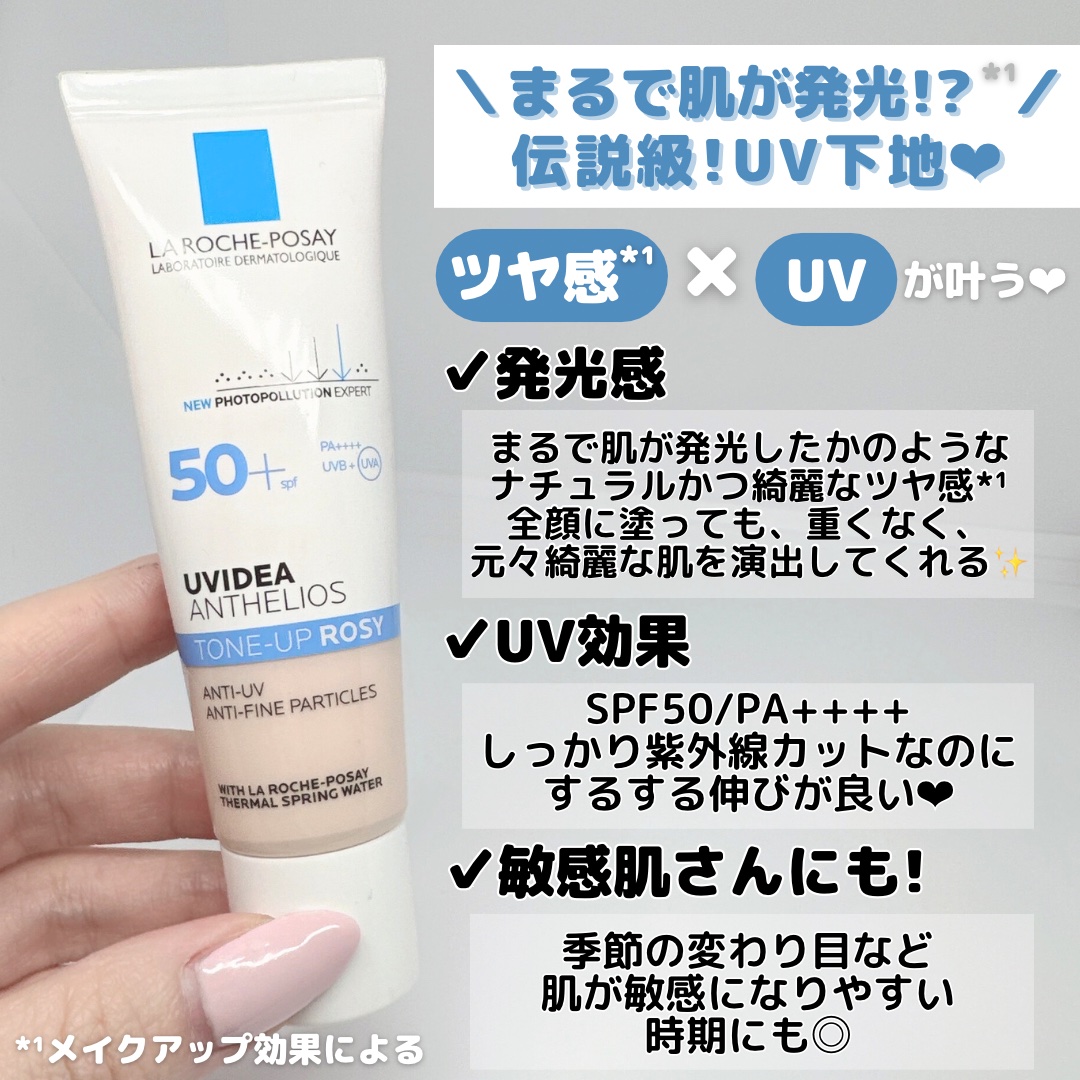 敏感肌でも試しやすい低刺激設計だったり、紫外線、PM2.5から肌を保護してくれたり、石鹸オフもできるし良い所たくさん♡ トーンアップ、カバー力はまぁまぁあって仕上がりも内側から発光したようなツヤ感* めちゃくちゃ敏感肌な人はラ ロッシュ ポゼ推してる人多いイメージ!