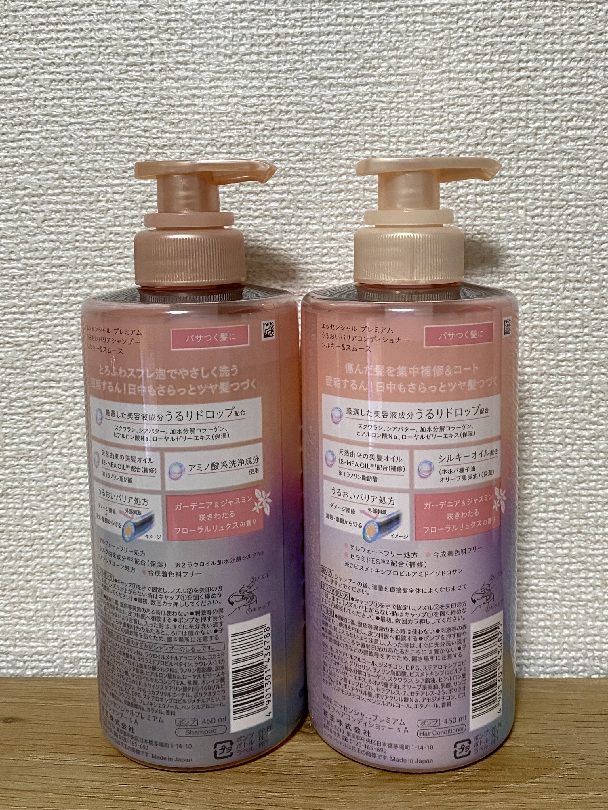 ときめく香りのシャンプー&コンディショナー💕エッセンシャルプレミアムシリーズうるおいバリアシャンプー&コンディショナーをお試ししてみたので紹介します☺️エッセンシャルプレミアムうるおいバリアシャンプーシルキー&スムース内容量:450mlとろふ...