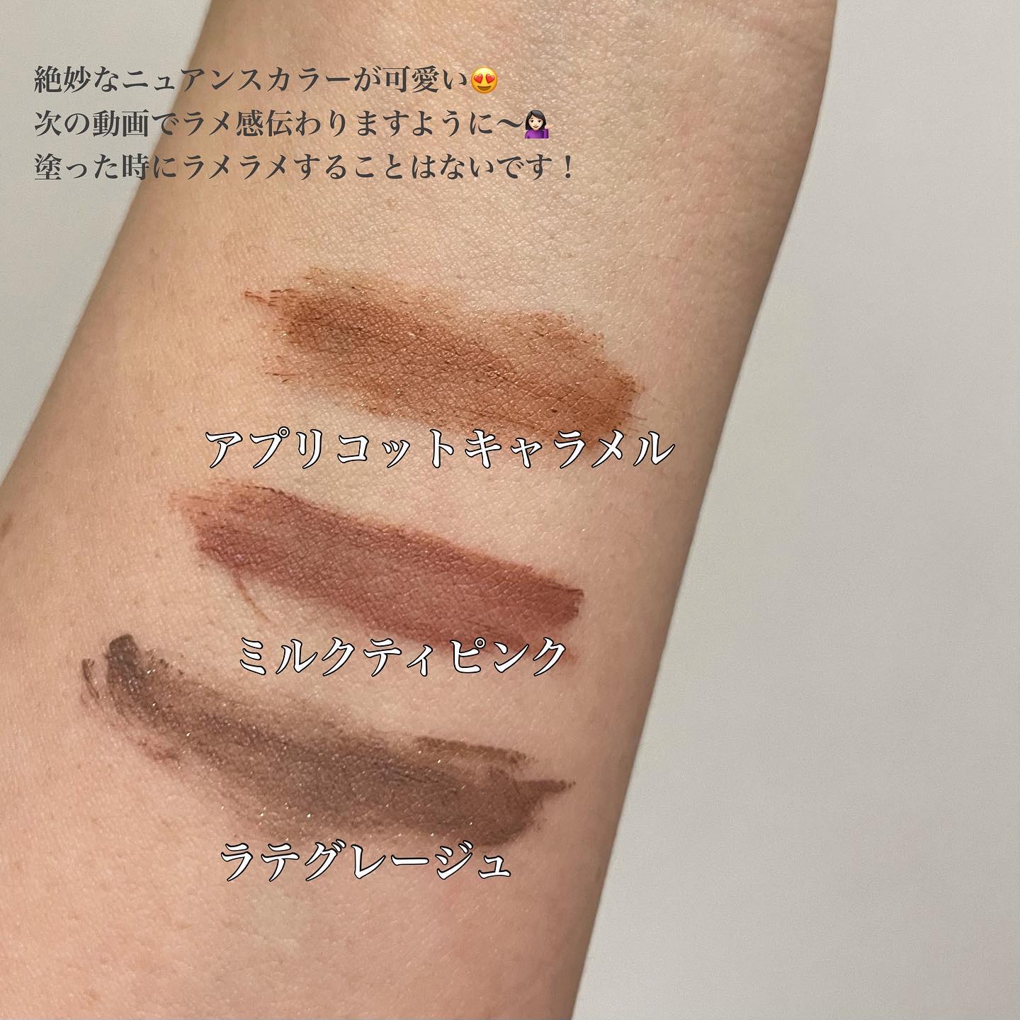 - <アプリコットキャメル> 水、アクリレーツコポリマー、BG、DPG、オクチルドデカノール、シリカ、エタノール、ジエチルヘキサン酸ネオペンチルグリコール、1,2-ヘキサンジオール、ペンチレングリコール、パンテノール、アルガニアスピノサ核油、トコフェロール、(HDI/トリメチロールヘキシルラクトン)クロスポリマー、メタクリル酸メチルクロスポリマー、(ベヘン酸/エイコサン二酸)ポリグリセリル-10、ケイ酸(Al/Mg)、セテス-20、メチルパラベン、PEG-40水添ヒマシ油、セルロースガム、ヒドロキシエチルセルロース、フェノキシエタノール、エチルヘキシルグリセリン、(+/-)マイカ、タルク、グンジョウ、酸化チタン、酸化鉄、合成フルオロフロゴパイト、酸化スズ、水酸化Al <ミルクティピンク> 水、アクリレーツコポリマー、BG、DPG、オクチルドデカノール、シリカ、エタノール、ジエチルヘキサン酸ネオペンチルグリコール、1,2-ヘキサンジオール、ペンチレングリコール、パンテノール、アルガニアスピノサ核油、トコフェロール、(HDI/トリメチロールヘキシルラクトン)クロスポリマー、メタクリル酸メチルクロスポリマー、(ベヘン酸/エイコサン二酸)ポリグリセリル-10、ケイ酸(Al/Mg)、セテス-20、メチルパラベン、PEG-40水添ヒマシ油、セルロースガム、ヒドロキシエチルセルロース、フェノキシエタノール、エチルヘキシルグリセリン、(+/-)マイカ、タルク、グンジョウ、酸化チタン、酸化鉄、合成フルオロフロゴパイト、酸化スズ、水酸化Al <ラテグレージュ> 水、アクリレーツコポリマー、BG、DPG、オクチルドデカノール、シリカ、エタノール、ジエチルヘキサン酸ネオペンチルグリコール、1,2-ヘキサンジオール、ペンチレングリコール、パンテノール、アルガニアスピノサ核油、トコフェロール、(HDI/トリメチロールヘキシルラクトン)クロスポリマー、メタクリル酸メチルクロスポリマー、(ベヘン酸/エイコサン二酸)ポリグリセリル-10、ケイ酸(Al/Mg)、セテス-20、メチルパラベン、PEG-40水添ヒマシ油、セルロースガム、ヒドロキシエチルセルロース、フェノキシエタノール、エチルヘキシルグリセリン、(+/-)マイカ、タルク、グンジョウ、酸化チタン、酸化鉄、合成フルオロフロゴパイト、酸化スズ、水酸化Al