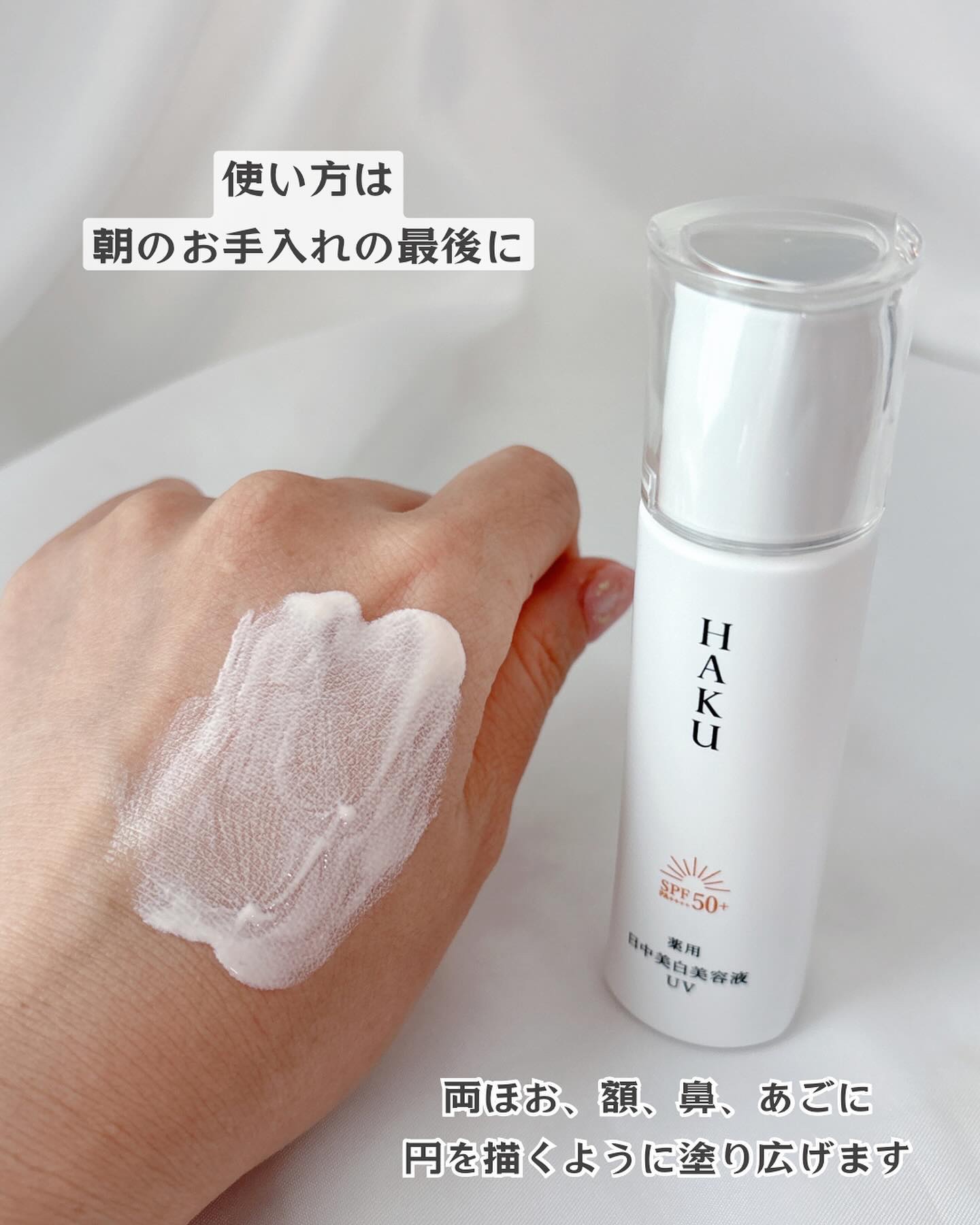 - 販売名「メラノフォーカスUV」 SPF50+・PA++++ 日中のHAKU。光を浴びる時間も味方に、日中だからできる美白ケアのアプローチ。 シミ予防研究の先端技術を搭載し、日中ならではの美白ケアを可能にした、薬用日中美白美容液です。光を浴びる時間も味方にして、明るく透明感のある肌に導きます。 ○2種の美白有効成分を肌の奥まで届け効かせる。 ○日中の肌環境に着目し、Wデイエフェクターを配合。うるおいを与え届ける。 〇ファインレッドパールαが効果的に光を放ち、シミや色ムラを目立たせない。トーンアップ効果で、明るく透明感のある仕上がり。 〇みずみずしい美容液がスーッとなじむ。化粧下地としても使える。 ○無香料・アレルギーテスト済み・ニキビのもとになりにくい処方。 (全てのかたにアレルギーが起きない、ニキビができないというわけではありません)。