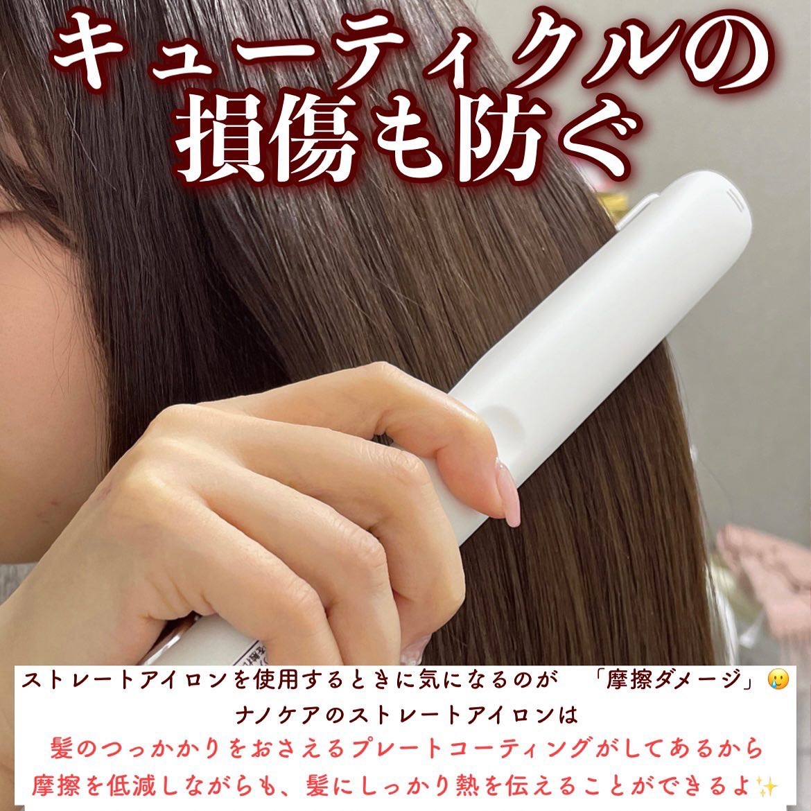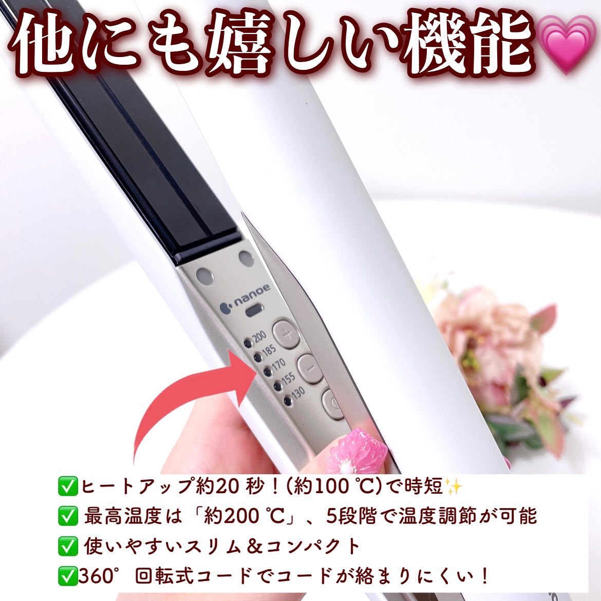 使うたび、しっとりツヤ髪に! 髪にムラなく熱を伝える温度均ープレート採用。外側に吹き出し口を搭載し広範囲に高浸透ナノイーを拡散! ヒートアップ時間(約100℃)約20秒とプレートが温まるのも早い!