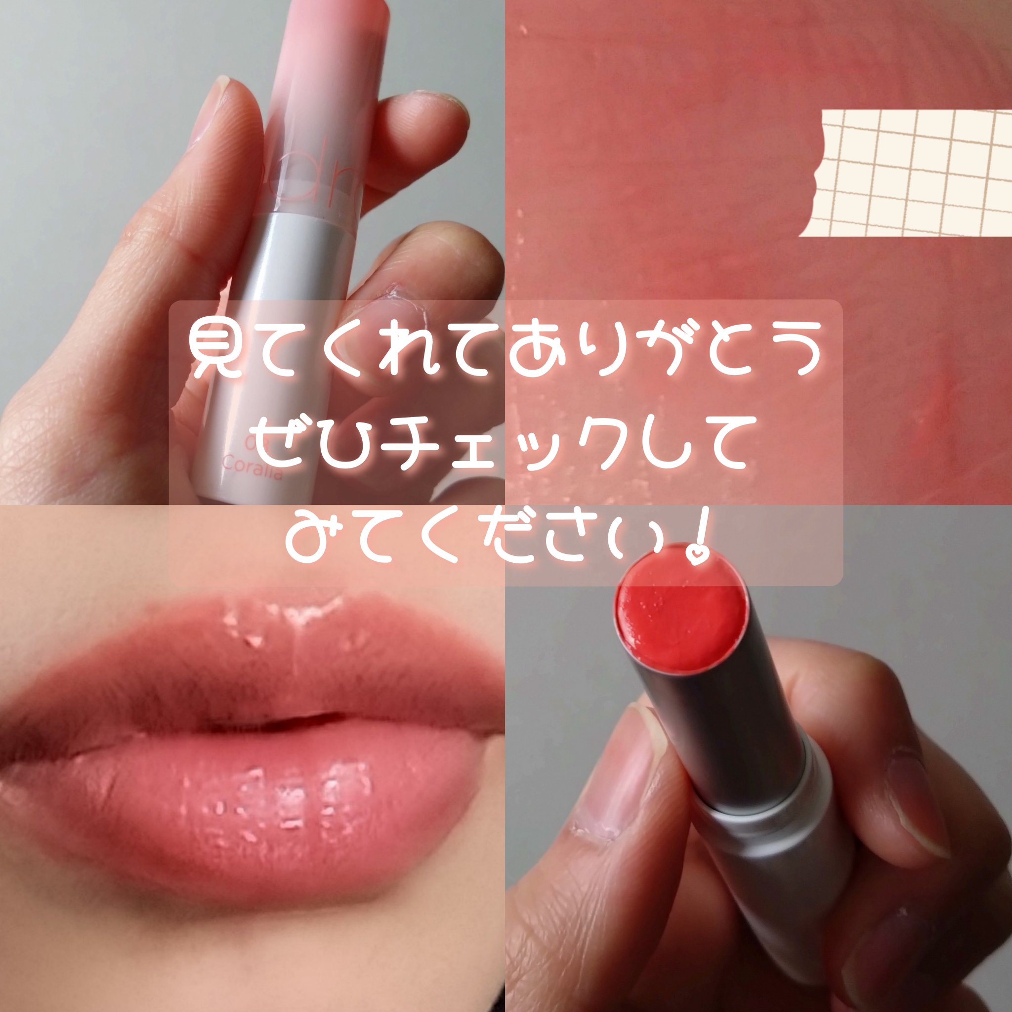 - もちっとした水膜で弾けそうなツヤリップ 1.軽い塗り心地のなめらかで透明な水爆弾ツヤ 2.塗った瞬間から唇を鮮やかに彩る多彩なカラーバーム 3.植物性保湿オイルでしっとりもっちり保湿バーム