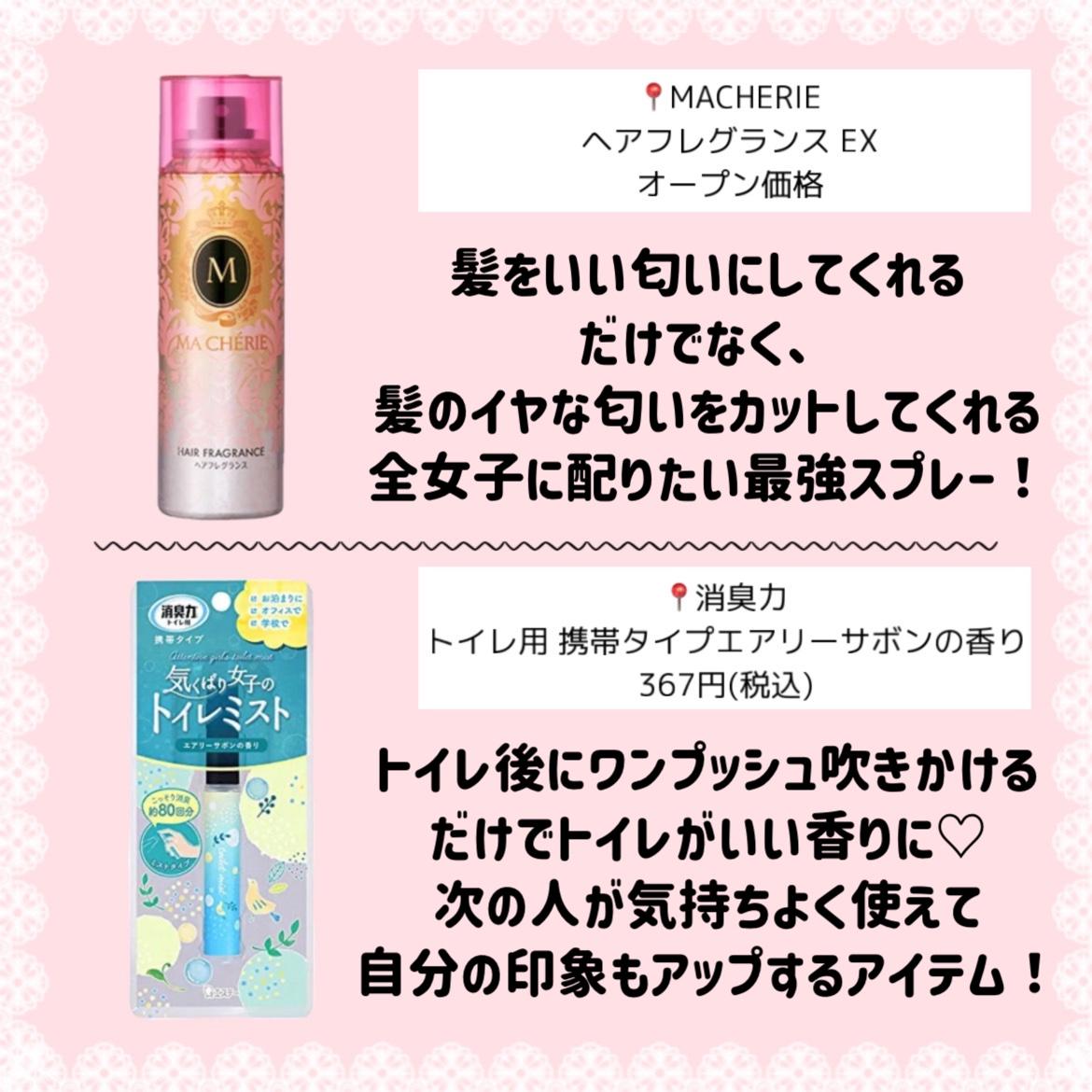 マシェリのヘアフレグランスいいよね❤️ 香りが女の子だよね〜!りんかちゃんの前の投稿見て買ったよ〜 マウスウォッシュスプレーは持ってるんだけどブレスケアは使ったことないから使ってみるね!
