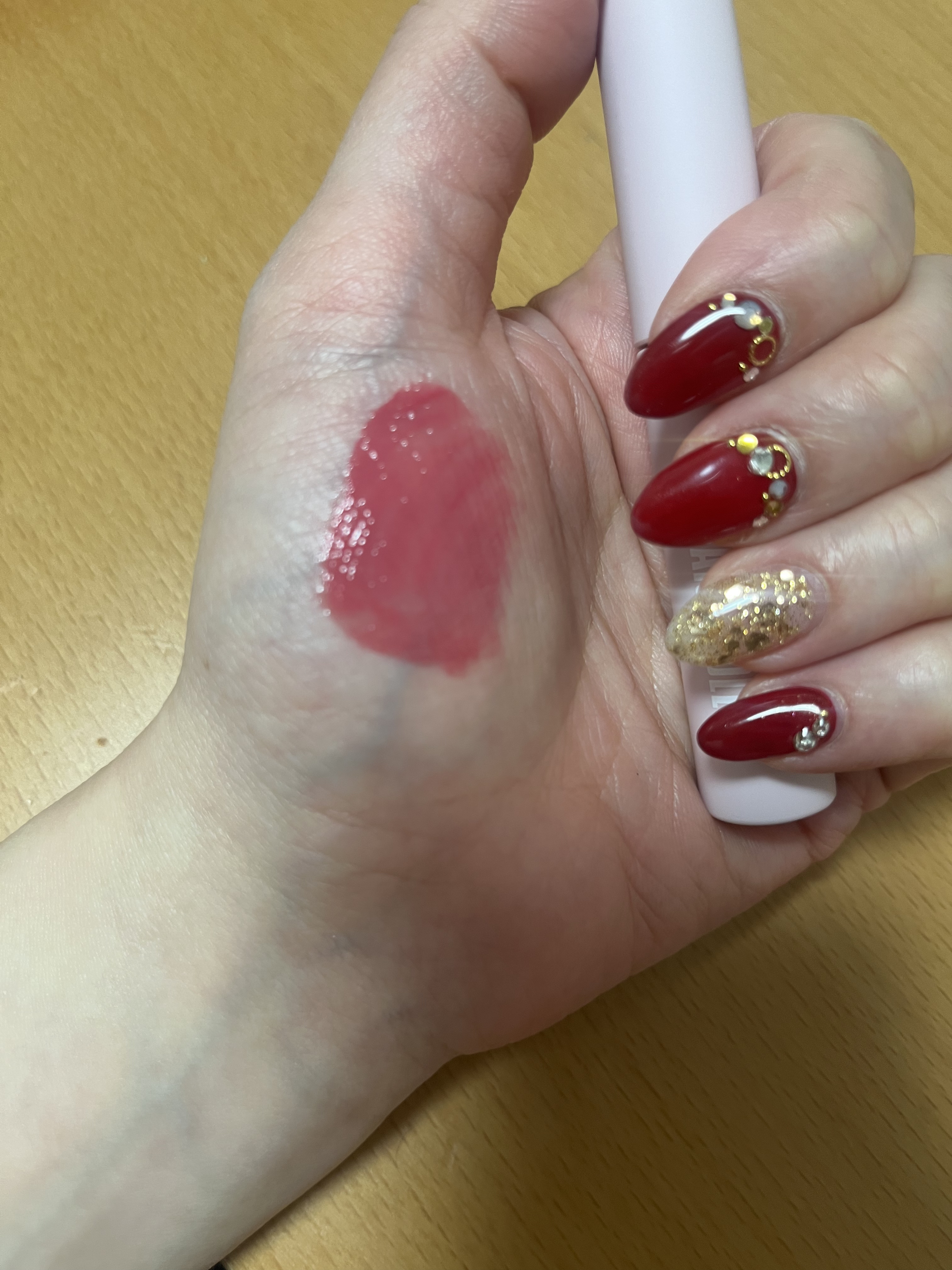 塗った瞬間からみずみずしいウォータリーなツヤが魅力のリップ💄💕 濡れたようなツヤツヤリップに仕上がります🥰 ベタベタせず使いやすく、ティッシュオフするとマスクでも落ちにくいです🙋🏻♀️✨ 塗った直後は青みのあるピンクっぽい色になり、あまり赤く発色しませんが、時間が経つと赤っぽく変わってきました👀 濃いめの発色です🙌🏻