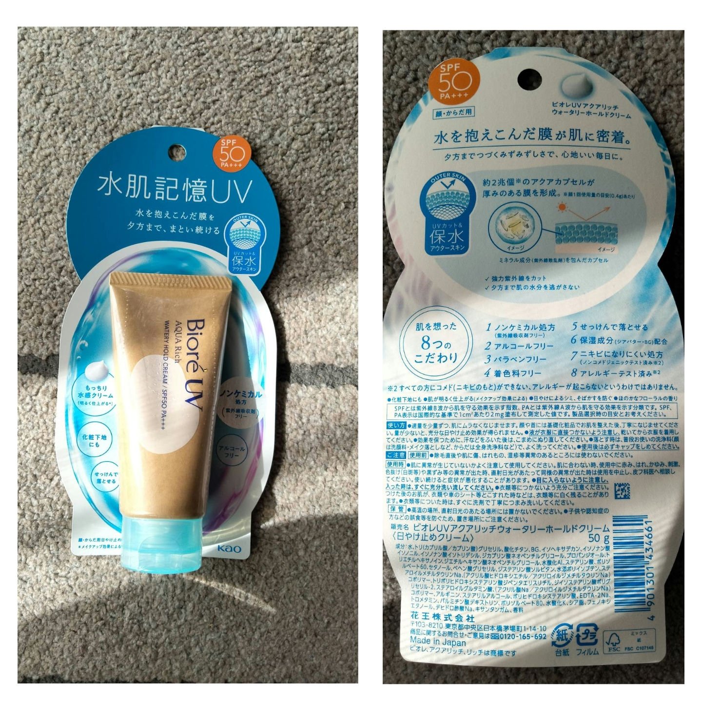 - ※2024年3月から、一部のドラッグストアで先行発売。2025年2月8日より全国発売開始。 アクアリッチシリーズ初のノンケミカルUV(紫外線吸収剤フリー)! アクアリッチウォータリーホールドクリーム(水肌記憶UV)。 約2兆個*のアクアカプセルが水を抱え込んだ膜を形成。 ✔強力紫外線をカット(SPF50/PA+++) ✔長時間肌の水分を逃がさないから、みずみずしさつづく。 もっちり水感クリーム。圧迫感の少ない軽い付け心地。 <肌を想ったこだわり> ・ノンケミカル処方(紫外線吸収剤フリー) ・アルコールフリー ・酸化亜鉛フリー ・パラベンフリー ・着色料フリー ・せっけんで落とせる *顔1回使用量の目安(0.4g)あたり