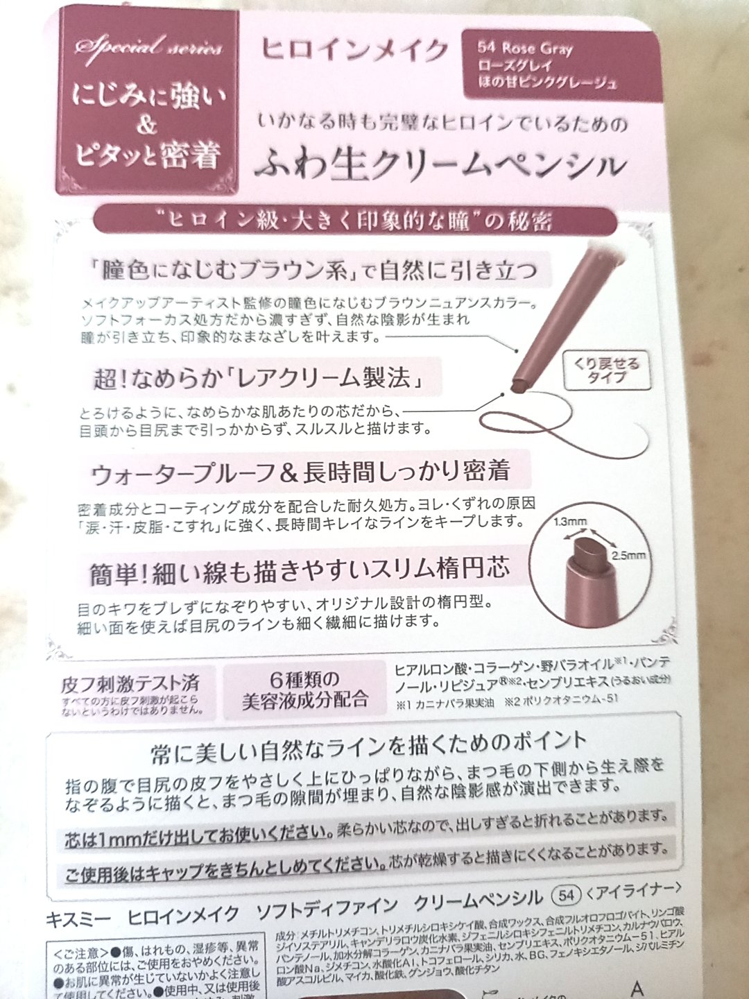 - 1.「瞳色になじむブラウン」で自然に引き立つ ヘアメイクアップアーティスト監修の瞳色になじむブラウン。 ソフトフォーカス処方だから濃すぎず、自然な陰影が生まれ瞳が引き立ち、印象的なまなざしを叶えます。 2.超!なめらか「レアクリーム製法」 とろけるように、なめらかな肌あたりの芯だから、目頭から目尻まで引っかからず、スルスルと描けます。 3.ウォータープルーフ&長時間しっかり密着 密着成分とコーティング成分を配合した耐久処方。ヨレ・くずれの原因「涙・汗・皮脂・こすれ」に強く、長時間キレイなラインをキープします。 4.簡単!描きやすいスリム楕円芯 目のキワをブレずになぞりやすい、オリジナル設計の楕円型。 細い面を使えば目尻のラインも繊細に描けます。 5.6種類の美容液成分配合 ヒアルロン酸・コラーゲン・野バラオイル※1・パンテノール・リピジュア®※2・センブリエキス (うるおい成分) ※1 カニナバラ果実油 ※2 ポリクオタニウム - 51