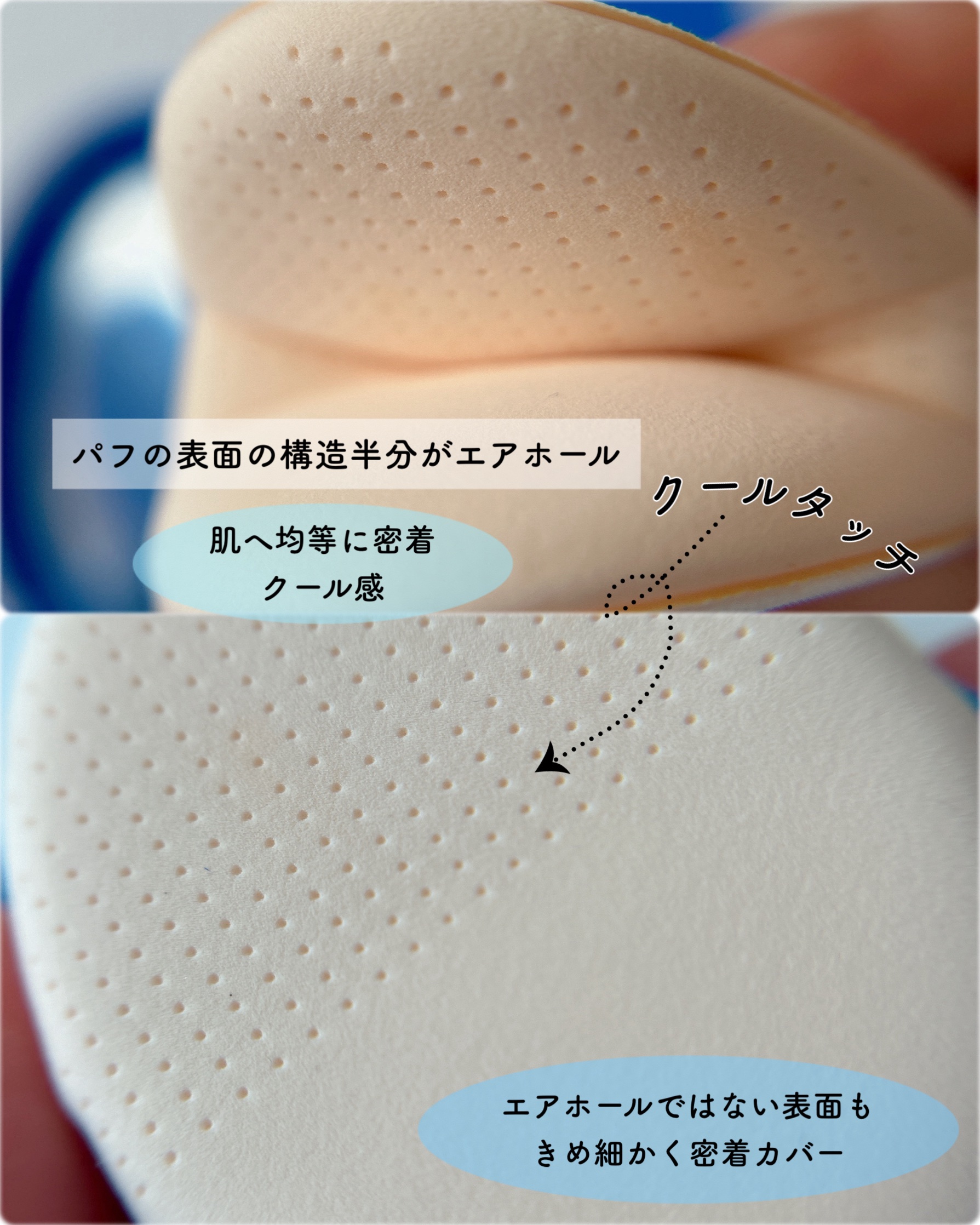 - SPF 50+ PA++++ ◇ひんやり感のある成分でクールな使い心地 ①水分クール感 FREEZEAWAY ✓ *全成分:ブチレングリコール、メンチルピーシーエー、エチルメンタンカボクサイド ②水分バリア AQUA CERAMIDE ✓ 肌保湿及びクール感 *全成分:グリセリン、精製水、カプリリック/カプリクトライグリセライド、ハイドロジェネ テッドレシチン、セラミドNP、ソジウムステアロールグルタミン酸 ③クール COOL GREEN COMPLEX ✓ 肌保湿及びクール感 *全成分:グリセリン、精製水、ポルスアップルミント葉エキス、緑茶エキス、タイム葉エキス ◇長時間メイクキープができるファンデーションいらずの日焼け止め 華やかなアプリコット色のトーンアップ*カバーで自然で健康的な肌印象に仕上げます。ファンデーションの代わりとして利用できるため、肌にも優しい使い心地、忙しい朝にもぴったりです。マスクを付けても崩れにくく、白浮きがしにくいなめらかな密着で長時間メイクをキープしてくれます。 *メイクアップ効果による ◇塗りやすい卵型のパフ パフは塗りやすい卵型を採用しました。パフ表面のエアホールにより、肌へ均一に密着&クール感をもたらします。