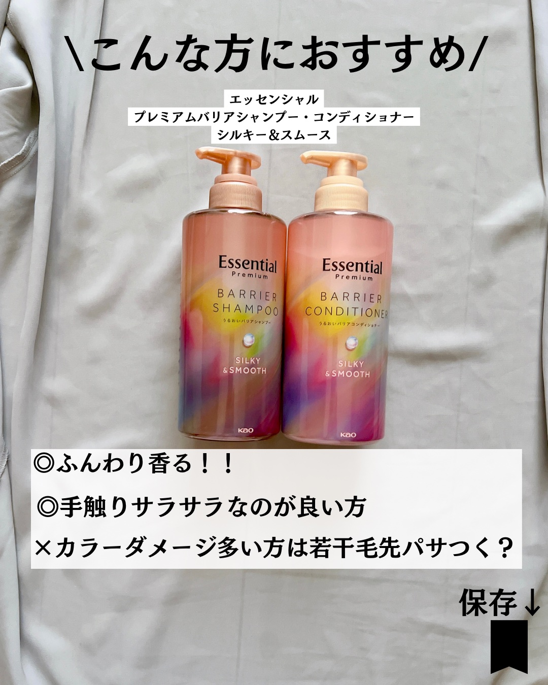 パサつく髪に。とろふわスフレ泡でやさしく洗う。翌朝するん!日中もさらっとツヤ髪つづく。エッセンシャルプレミアム🌸🫧『バリアシャンプーコンディショナーシルキー&スムース』𓈒𓏸𓐍𓂃𓈒𓏸𓂃◌𓈒𓐍𓈒𓈒𓏸𓐍𓂃𓈒𓏸𓂃◌𓈒𓐍𓈒泡立ちがとってもよくしっかり洗...