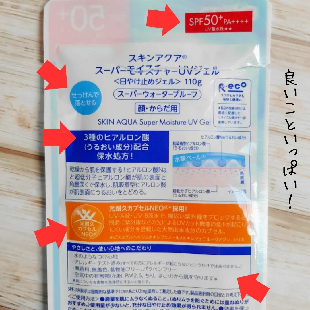 【スキンアクア】スーパーモイスチャージェルポンプタイプ購入しました。UV耐水性が書いてるので新しいバージョンかな?と思います。水のような軽いつけ心地で、ジェルタイプならではのうるおい感。顔にも身体にも使える万能UVで、SPF50+/PA+++...