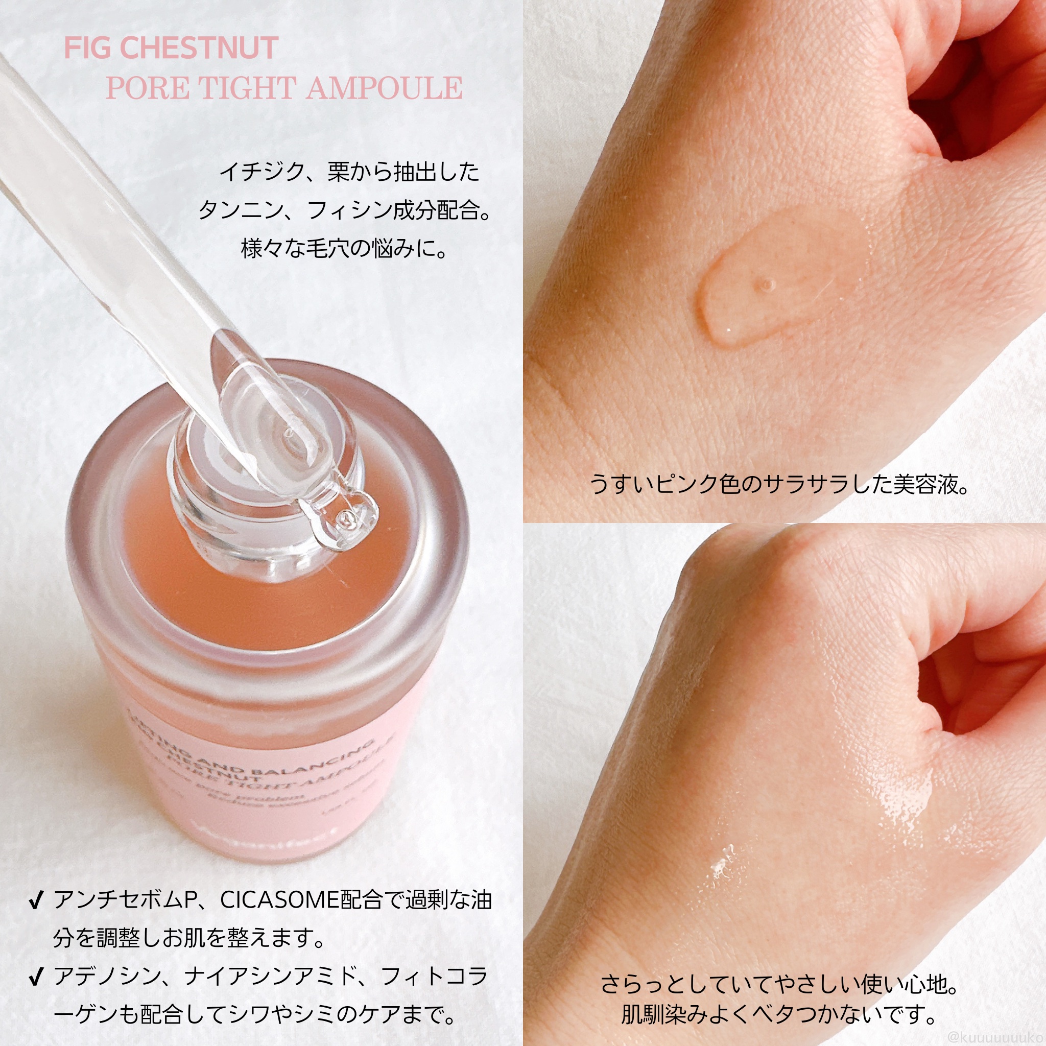 ピンクのカラーがかわいい美容液🩷 見た目と打って変わって実力派💪 イチジク由来のタンニンを主成分に、毛穴を目立たなくしてくれる成分を豊富に含んでるよ✨ イチジクバームマイクロフルダイジング工法 ∟独自開発技術でより小さな粒子にすることでお肌に行き渡りやすく 特に匂いもなく、肌なじみもいい美容液✨ ただ個人的な感覚だけど、オイルを塗ったような感じに一瞬なる🥺