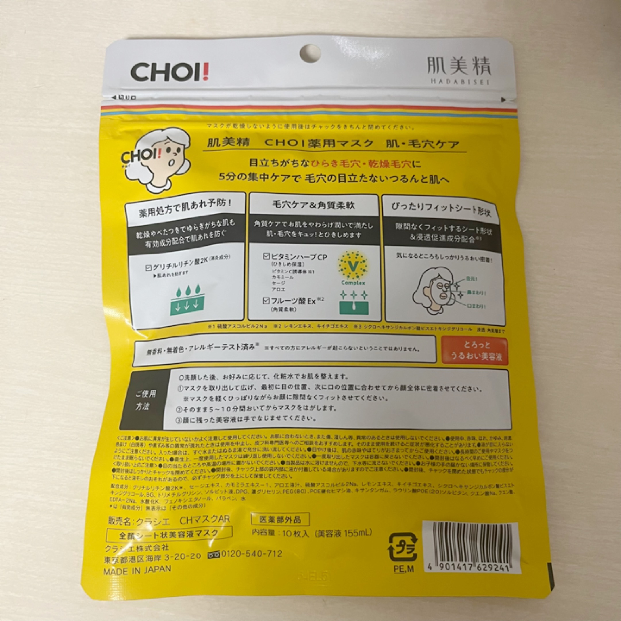 - 【医薬部外品】 ●チョイッと手軽に肌・毛穴悩み*1を集中ケア! 肌美精CHOIシリーズ 肌・毛穴ケアライン ●目立ちがちな毛穴汚れ・ひらき毛穴*1・乾燥毛穴に。薬用処方で肌あれを予防しながら毛穴の目立たないつるんと肌へ。 ●5分*2の集中ケアの薬用シートマスク ●有効成分(消炎)「グリチルリチン酸2K」配合。肌あれを防ぎます。 ●ひきしめ保湿成分「ビタミンハーブCP*3」&角質柔軟成分「フルーツ酸Ex*4」配合。角質ケアでお肌をやわらげうるおいで満たし、毛穴が気になる肌をキュッとひきしめます。 ●ぴったりフィットシート形状&浸透サポート成分*5配合で、気になるところもしっかり密着してうるおいます。 ●とろっとうるおい美容液 ●無香料、無着色 ●アレルギーテスト済み*6 *1:古い角質の蓄積による *2:お手入れ目安時間 *3:ビタミンC誘導体(硫酸アスコルビル2Na)、カモミール、セージ、アロエ CP:Complex *4:レモンエキス、キイチゴエキス *5:シクロヘキサンジカルボン酸ビスエトキシジグリコール(浸透:角質層まで) *6:全ての方にアレルギーが起こらないということではありません。 〇洗顔した後、お好みに応じて、化粧水でお肌を整えます。 ①マスクを取り出して広げ、最初に目の位置、次に口の位置に合わせてから顔全体に密着させてください。 ※マスクを軽くひっぱりながらお顔に隙間なくフィットさせてください。 ②そのまま5~10分間おいてからマスクをはがします。 ③顔に残った美容液は手でなじませてください。
