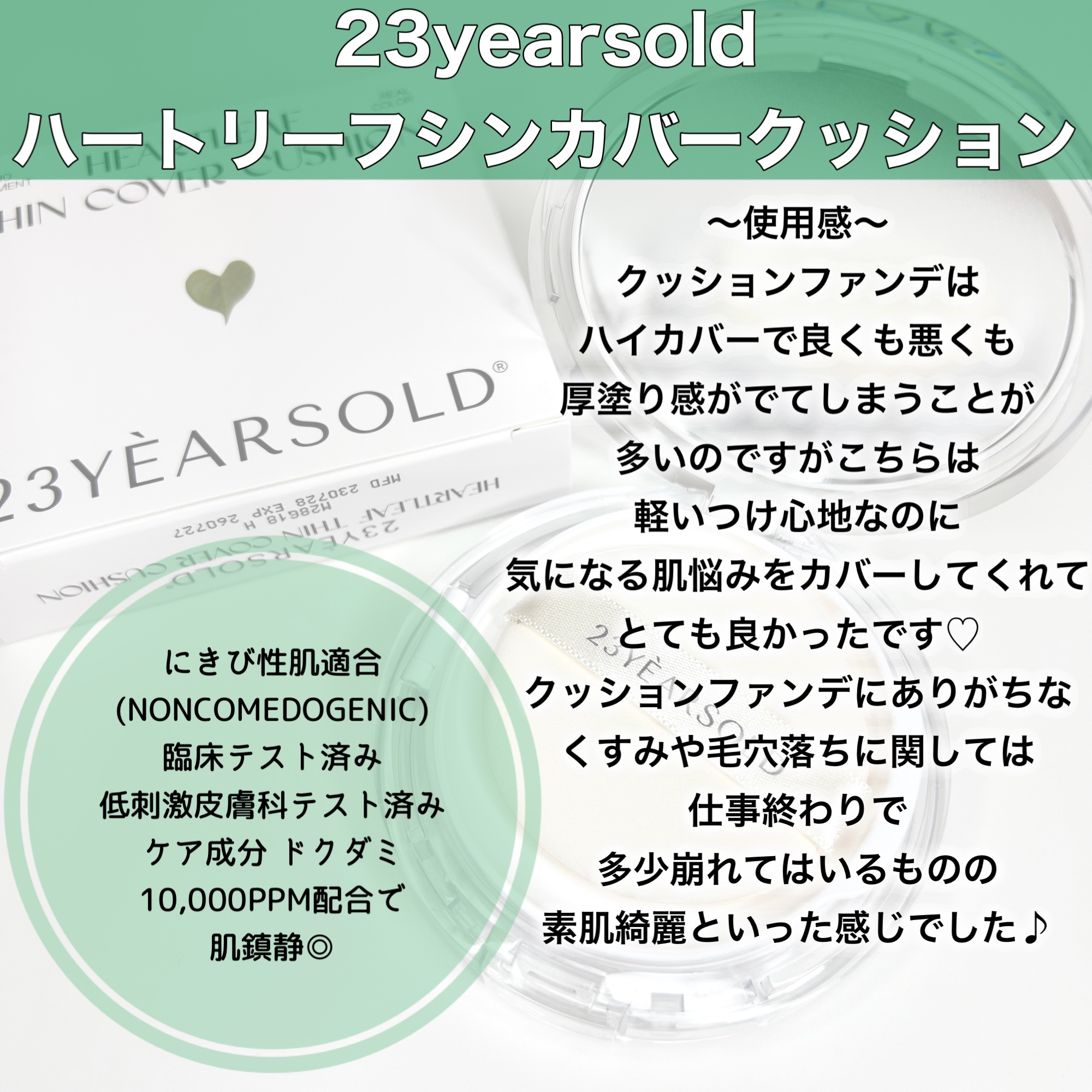 23yearsoldハートリーフシーンカバークッション21号 マシュマロベージュ肌鎮静効果のあるドクダミ10,000PPM配合。トラブル肌・敏感肌も使える低刺激クッションファンデーション◡̈ほんのり自然なツヤもあるセミマット仕上がりです。少量...