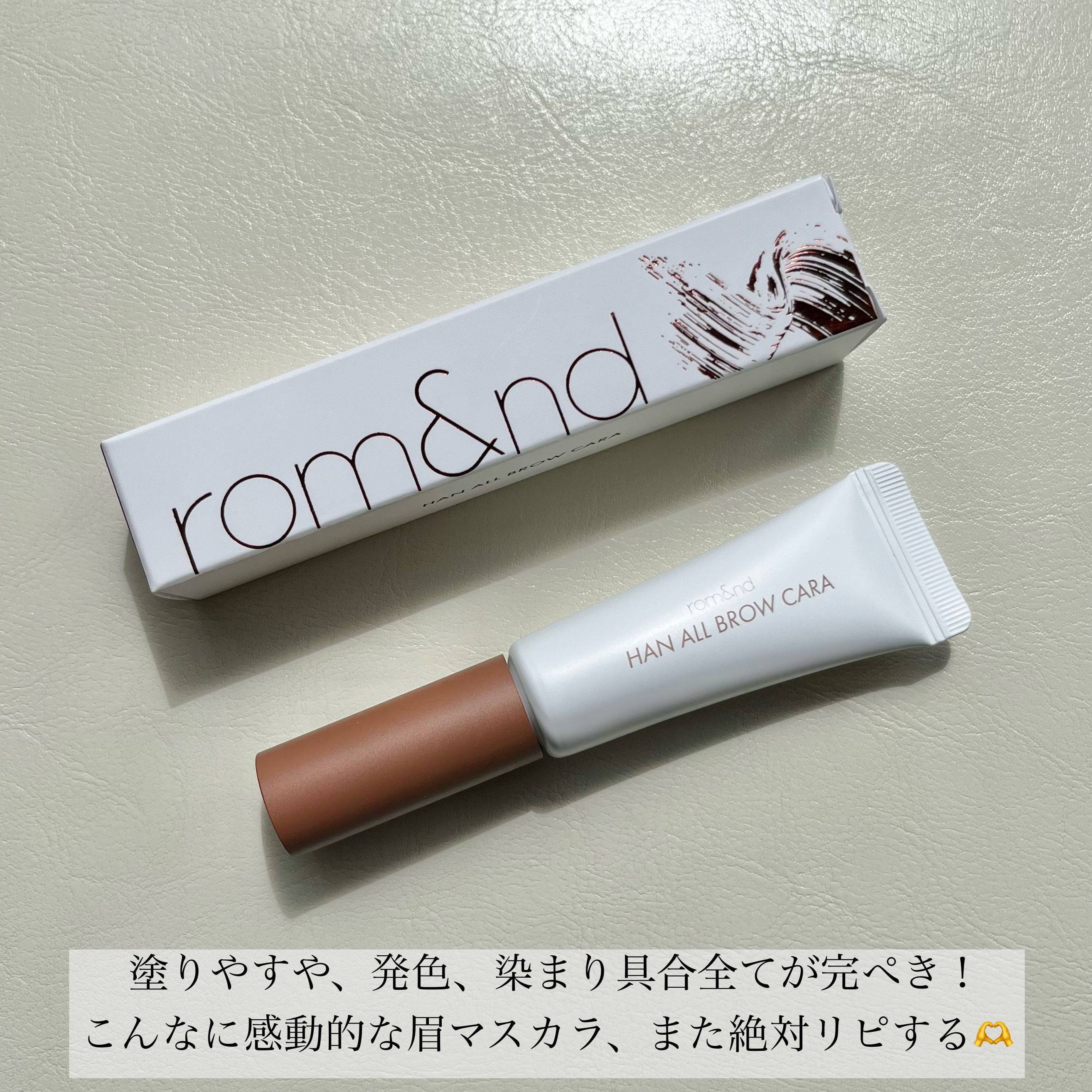 このアイブロウは今まで使った中で1番良かった! 絶妙なカラーで自然に眉の存在感をけしてくれます。 ハンオールブロウカラひと塗りで柔らかな存在感のない眉になって垢抜けます。 rom&ndのハンオールブロウカラは自眉自体を柔らかく見せてくれて、アイメイクも映えるし、眉の描き方がちょっと失敗してもなんとかなります😄