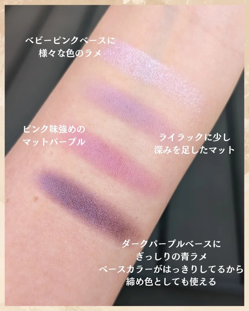 マットの発色をご覧ください。 マットでここまで発色するのって、珍しい。 特にパープル系のマットは、作るのが難しいらしく、ハイブランドでも発色がよくブレンドしやすいマットパープルを作るのに苦労するそう。 ですがこちらのaztkのマットパープルは、一塗りですんごい発色。 しっとりしているわけではないのですが、しっかり密着してくれる感じもします。 逆にパール系は少し発色優しめかな?と思いますが、ニュアンス的に使う分には問題なし。 ラメはギラギラのラメではなくチラチララメで、とっても上品。 いろんなシャドウと組み合わせて無限大にアイメイクが楽しめそうです。