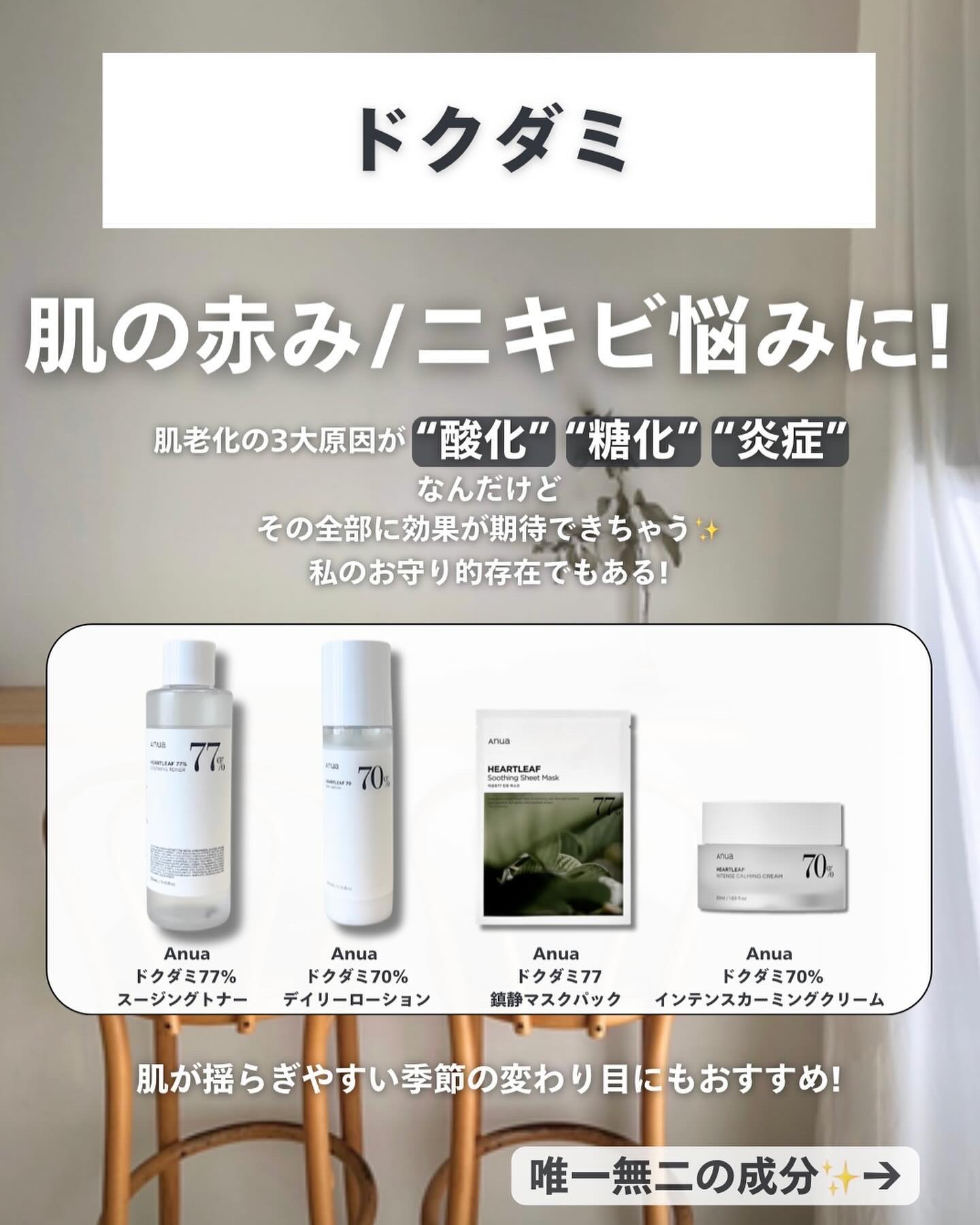 Anuaの美容液の組み合わせを紹介!みんなメガ割でAnuaの美容液買った人多いんじゃない? ニキビに悩む人におすすめしたい組み合わせは、アゼライン酸とシラカバ!この組み合わせ使うようになってニキビ出来にくくなった気がする🥺 ナラが最近ハマってる一推し組み合わせは、PDRNとレチノール✨ 毛穴ケアに最適で、使った後の肌のもっちり感がたまらん!