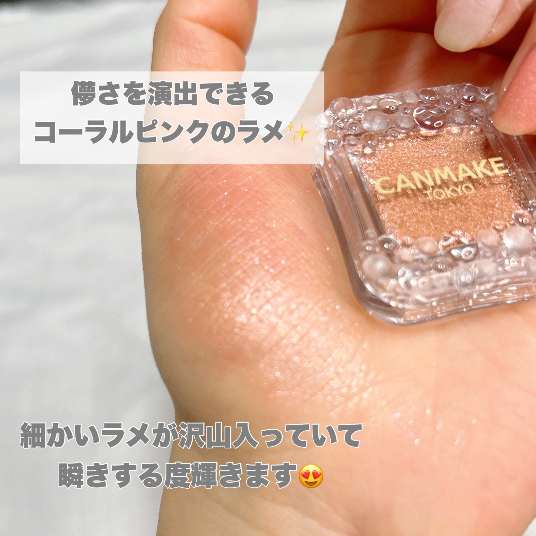 しっとりと密着感があり粉飛びしにくく 存在感のある2色のラメで華やかな目元に仕上がるアイシャドウ。 シアーで透け感のあるアプリコットカラーにたっぷりの大粒ラメが煌めくカラー✨ 黄みが強すぎず、イエベブルべ跨がるタイプに♡
