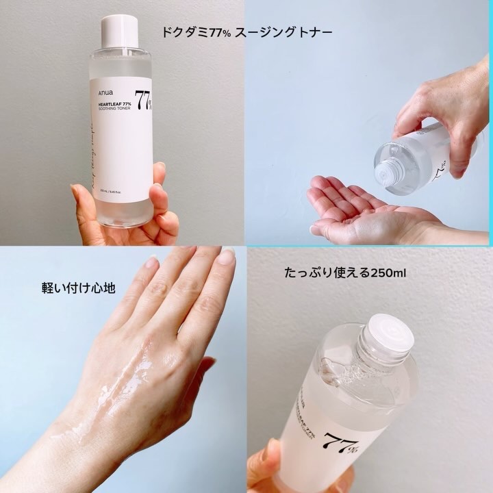 液体の77%がドクダミエキストナーで肌にピタッと密着してバランスを整えてくれるんだって🍃 軽やかなとろみテクスチャーでお肌にスーッとなじみ、ずっとなじむ化粧水♡ バシャバシャ使える容量たっぷり250mlが嬉しい!