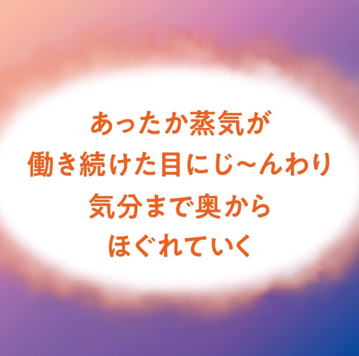 - 心地よい蒸気が働き続けた目と目元を温かく包み込み、リラックスタイムをサポートするアイマスク。 まるでお風呂のような心地よさ。快適温度約40℃、快適時間約20分。 一日の緊張感から解き放たれ、気分まで奥からじんわりほぐれていきます。つけた瞬間ふっくら。 さらに蒸気のチカラでふくらみ、目元にあわせて密着フィット。 つければたちまち、ひたるひとり時間。 眠る前に心地よいラベンダーの香りです。