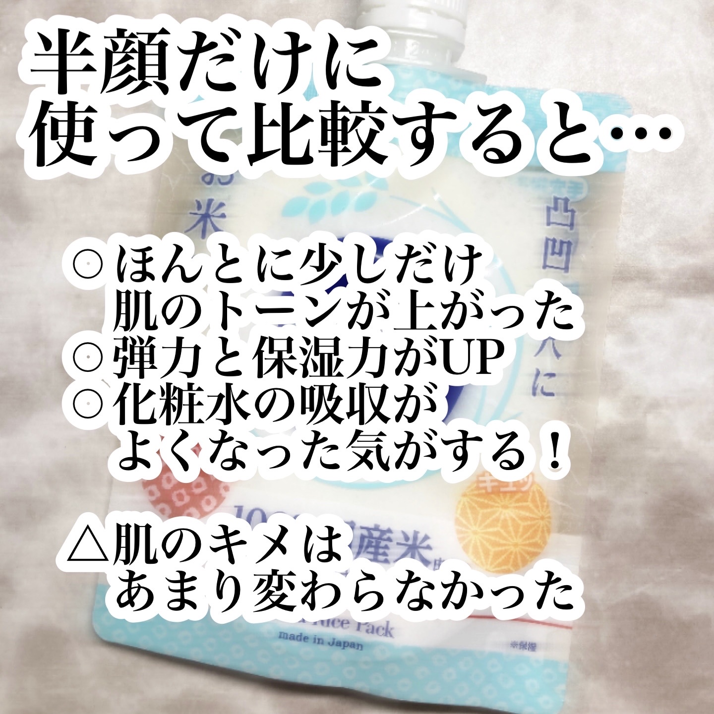 - <お米のパック> 水、BG、コメヌカ油、グリセリン、パルミチン酸エチルへキシル、ポリソルベート60、セタノール、ステアリン酸グリセリル、コメ発酵液、コメヌカエキス、コメヌカスフィンゴ糖脂質、アーチチョーク葉エキス、シア脂、乳酸桿菌、ベヘニルアルコール、ワセリン、水添レシチン、水添リゾレシチン、ペンチレングリコール、アルギニン、カルボマー、トコフェロール、マルトデキストリン、(ポリアクリル酸Na/ジアクリル酸PEG-9)クロスポリマー、シクロペンタシロキサン、水酸化K、フィチン酸、メチルパラベン、プロピルパラベン
