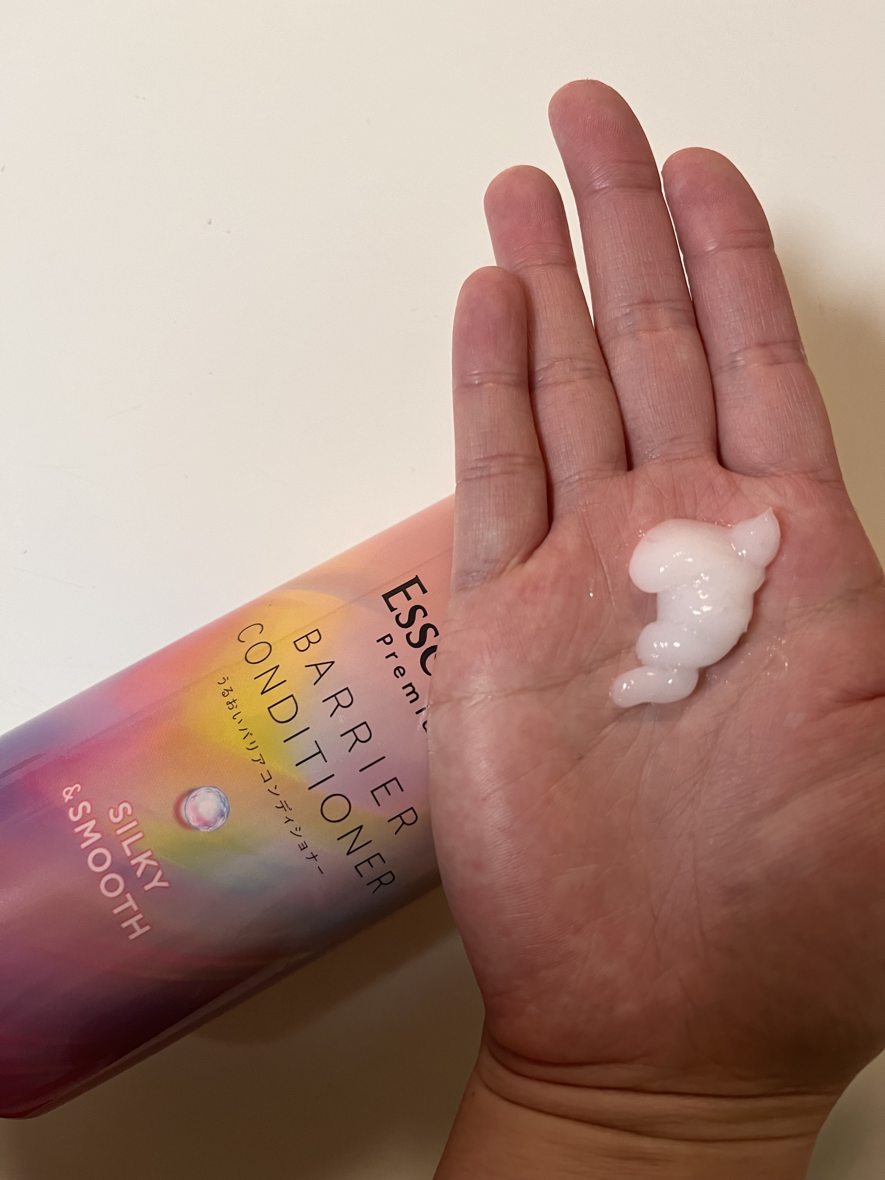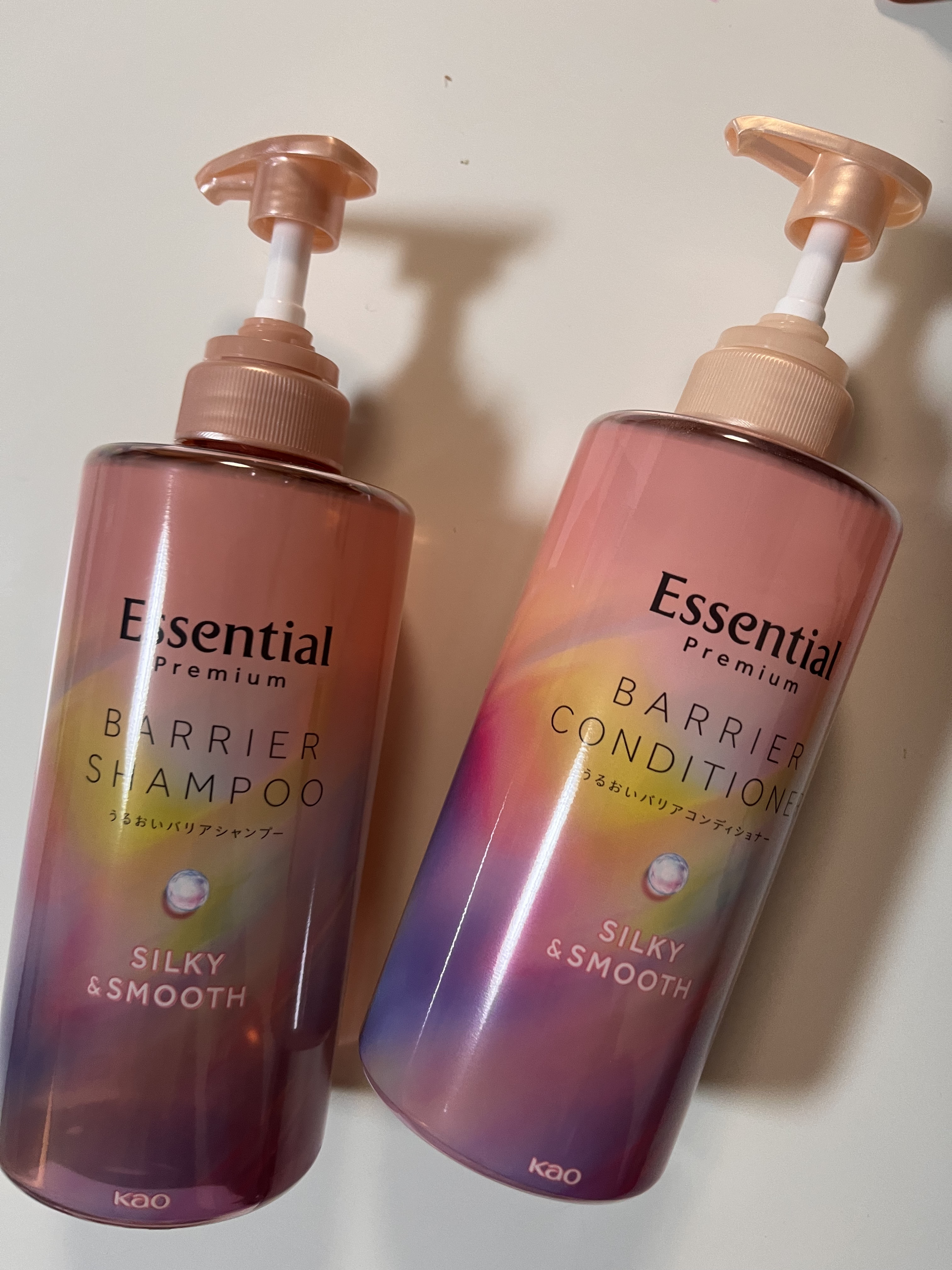 ♡エッセンシャル♡エッセンシャルプレミアムバリアシャンプー・コンディショナーシルキー&スムースシャンプーはふわふわ泡立ちが良く、全体的にピーチの香りに包まれとても幸せな気分になりました🍑コンディショナーをすると指通りがつるんと全体的なまとまり...