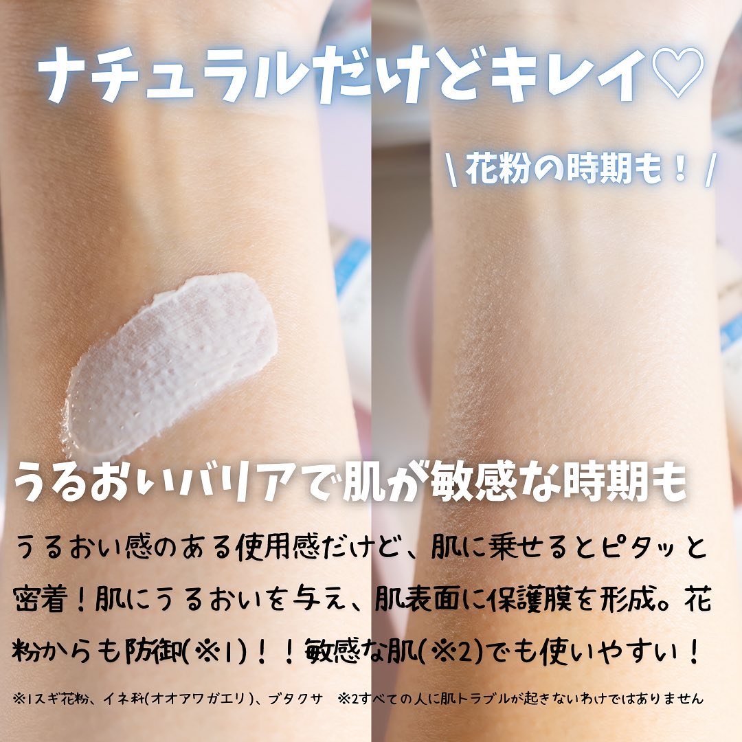 肌に潤いを与えて肌表面に保護膜を作ってくれて 花粉からも肌を守ってくれるのとこ、推せるしかない。※スギ花粉、ブタクサ、イネ科(オオアワガエリ) 塗るとピターっと密着感があって、私が1番好きなタイプ。使いやすい。 今の時期下地に迷ってる方はぜひ試してみて◎