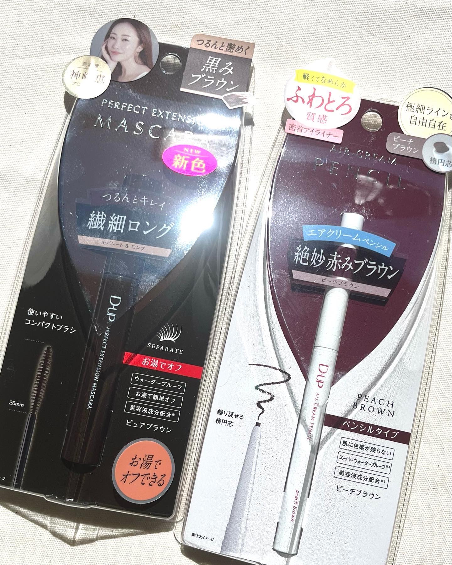 ディーアップパーフェクトエクステンションマスカラ 美容家神崎恵さんプロデュースのピュアブラウン🤎 コンパクトなブラシが使いやすくてとにかく軽く、仕上がりが綺麗なんだよね💓 自まつ毛が伸びたってくらい自然な色馴染み✨ まさに繊細ロング💗 綺麗なくるんとしたCカールをキープ☺️💓 ディーアップエアクリームペンシル 最近ハマってるペンシルライナー💓 カラーはピーチブラウン🍑🤎 ふんわりした優しいブラウンでマスカラのピュアブラウンとバッチリの組み合わせだった❤️