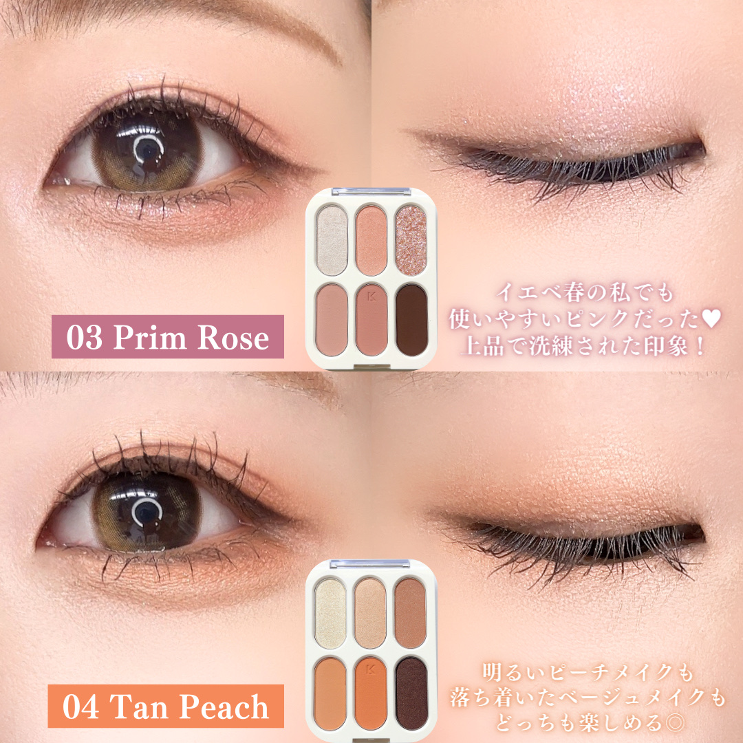 暖かみのあるピーチコーラル系パレットで、捨て色がなく全色使いやすいカラー🍑✨ 特にお気に入りのカラーは下段左から2番目のグリッター🫶オレンジブラウン系の大粒なキラキラが華やかで可愛かったです🥰 上段には落ち着いたカラーも沢山あるので、ナチュラルメイクやオフィスメイク等TPO問わず使いやすいパレットだと思います◎