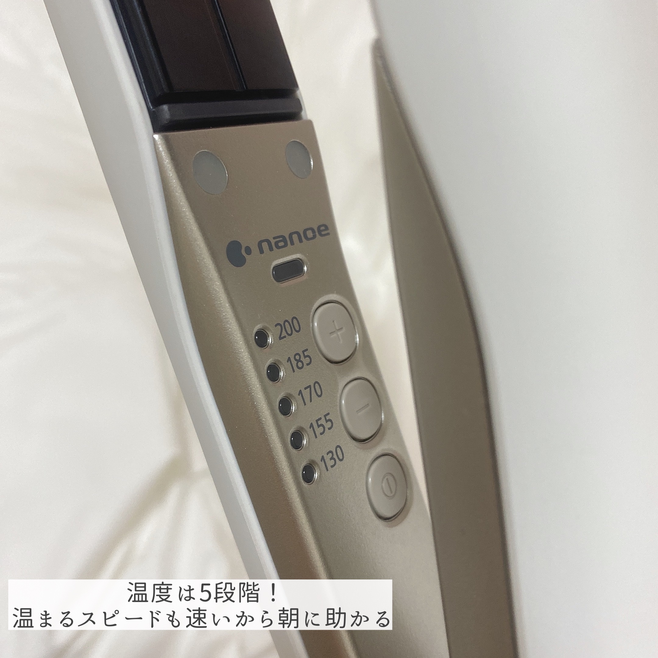 パナソニックの持つナノケアなどの技術が詰め込まれたストレートアイロン✨ 温度は5段階に調整でき、20秒で100℃まで上がるので温まるのも早いです💪 ナノケアを使用すると美容院でストレートにしてもらったときのようなサラサラの仕上がりになります!! 1回サッと通すだけでしっかり癖が解けてまっすぐな髪に仕上がるので、傷みにくいのではないかと思います🫶 仕上がりに本当に感動し、本当にお気に入りのアイテムです💕