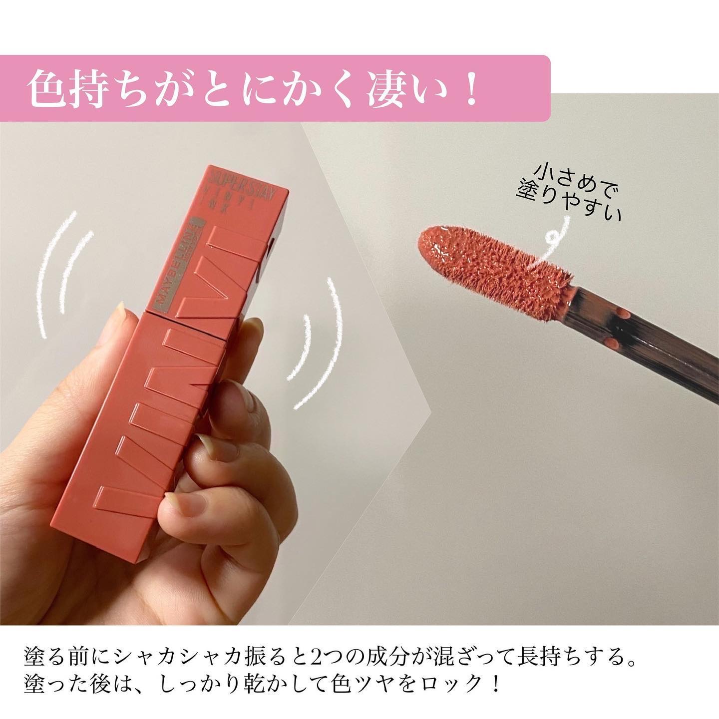 - メイベリン人気No.1リップ からツヤタイプついに誕生!*1 シャカシャカ振って!#落ちないリップ*2 色・ツヤ・仕上がり、全てロック。 〈製品特徴〉 ①シャカシャカ振って、長持ち効果! 膜形成成分*3と高濃度ピグメント*4の2層構造。 シャカシャカ振ると膜形成成分*3と高濃度ピグメント*4が混ざり、 色、ツヤ、仕上がりの長持ち効果! ②色もツヤも落ちない! 最長16時間続く、#落ちないリップ*2 メイベリン独自のトリプルロックフォーミュラ。色・ツヤ・仕上がり、全てロック。 食べても、飲んでも、塗りたての仕上がりが落とすまで続く。*2 ③濃密な発色とツヤをひと塗りで。 塗った瞬間、ムラなく発色。 顔色まで明るくトーンアップするような仕上がりに。*5 ④唇を包み込み、うるおい感ある仕上がりに。 乾燥しにくく、一日中*6心地良い仕上がりに。 塗った瞬間、唇をふっくらとみせ、縦じわが目立ちにくい。 *1:インテージSRI+調べ。2018年9月~2022年7月までのスーパー、ドラッグストア等におけるメイベリン ニューヨーク リップカテゴリーでの売上金額に基づく。 *2:着用16時間を想定した最長の場合において。メイクアップリムーバーで落とすことが可能です。メイベリン ニューヨーク調べ。個人差があります。 *3:トリメチルシロキシケイ酸、ポリプロピルシルセスキオキサン、アルキル(C30-45)ジメチルシリルポリプロピルシルセスキオキサン、ポリメチルシルセスキオキサン/トリメチルシロキシケイ酸。 *4:メイベリン従来品(ウォーター シャイニー ボリューミー パール)と比較において、3倍のピグメントを配合 *5:メイクアップ効果 *6:メイベリン ニューヨーク調べ。個人差があります。