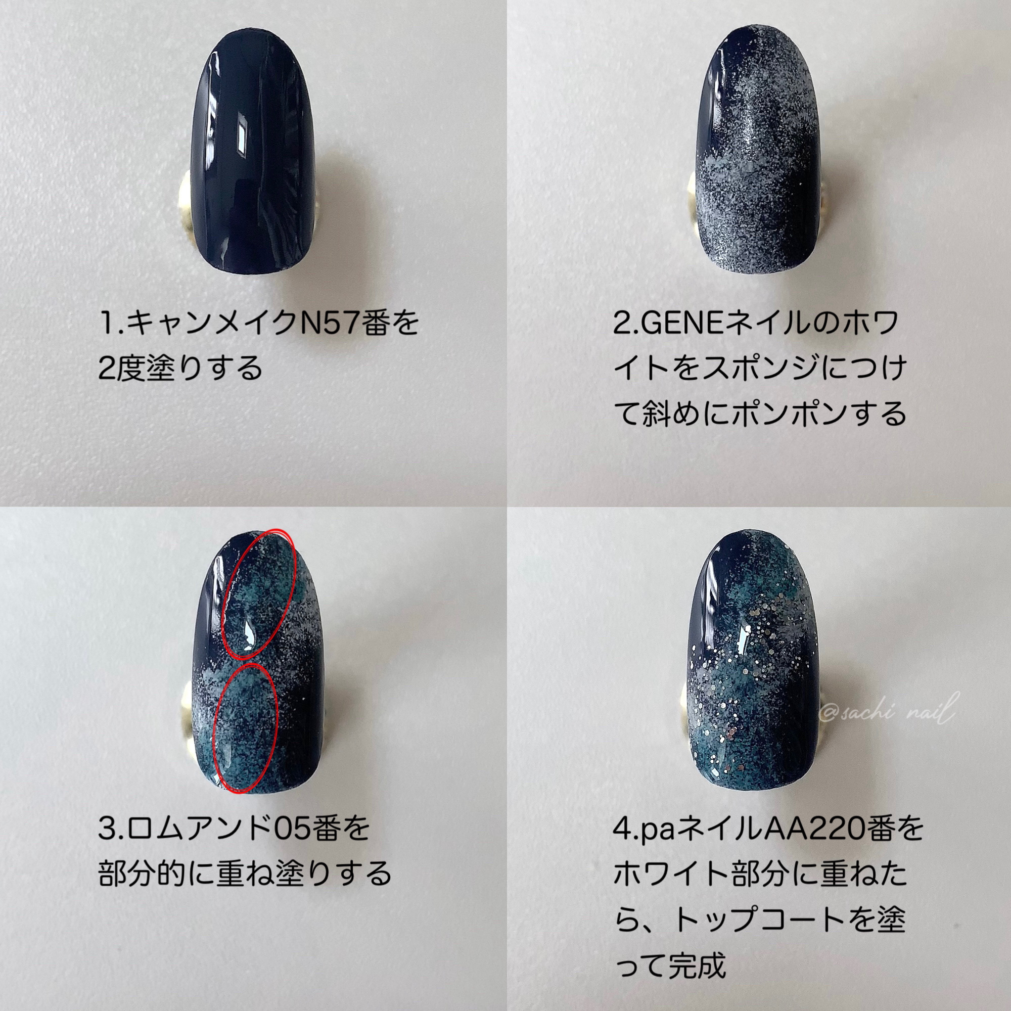 キャンメイクカラフルネイルズ N29ミルクシロップ N82クラウドレススカイ 親指、人差し指、小指は爪先にSV082で細いラインを描き、中指、薬指はAA225を重ねました。 ベースコート、トップコートはネイルホリックのものを使っています。