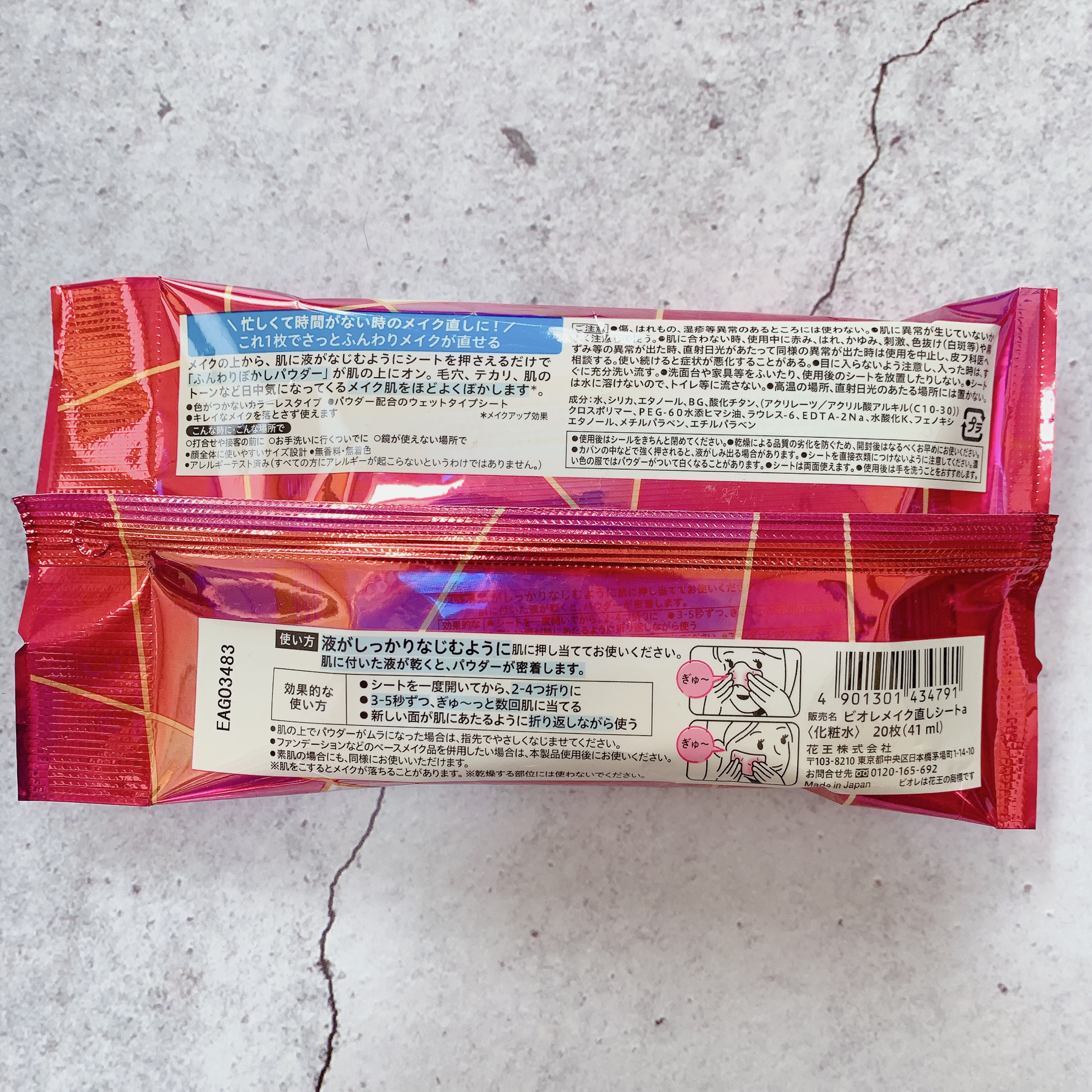 - <ビオレ メイク直しシート> 水、シリカ、エタノール、BG、酸化チタン、(アクリレーツ/アクリル酸アルキル(C10-30))クロスポリマー、PEG-60水添ヒマシ油、ラウレス-6、EDTA-2Na、水酸化K、フェノキシエタノール、メチルパラベン、エチルパラベン