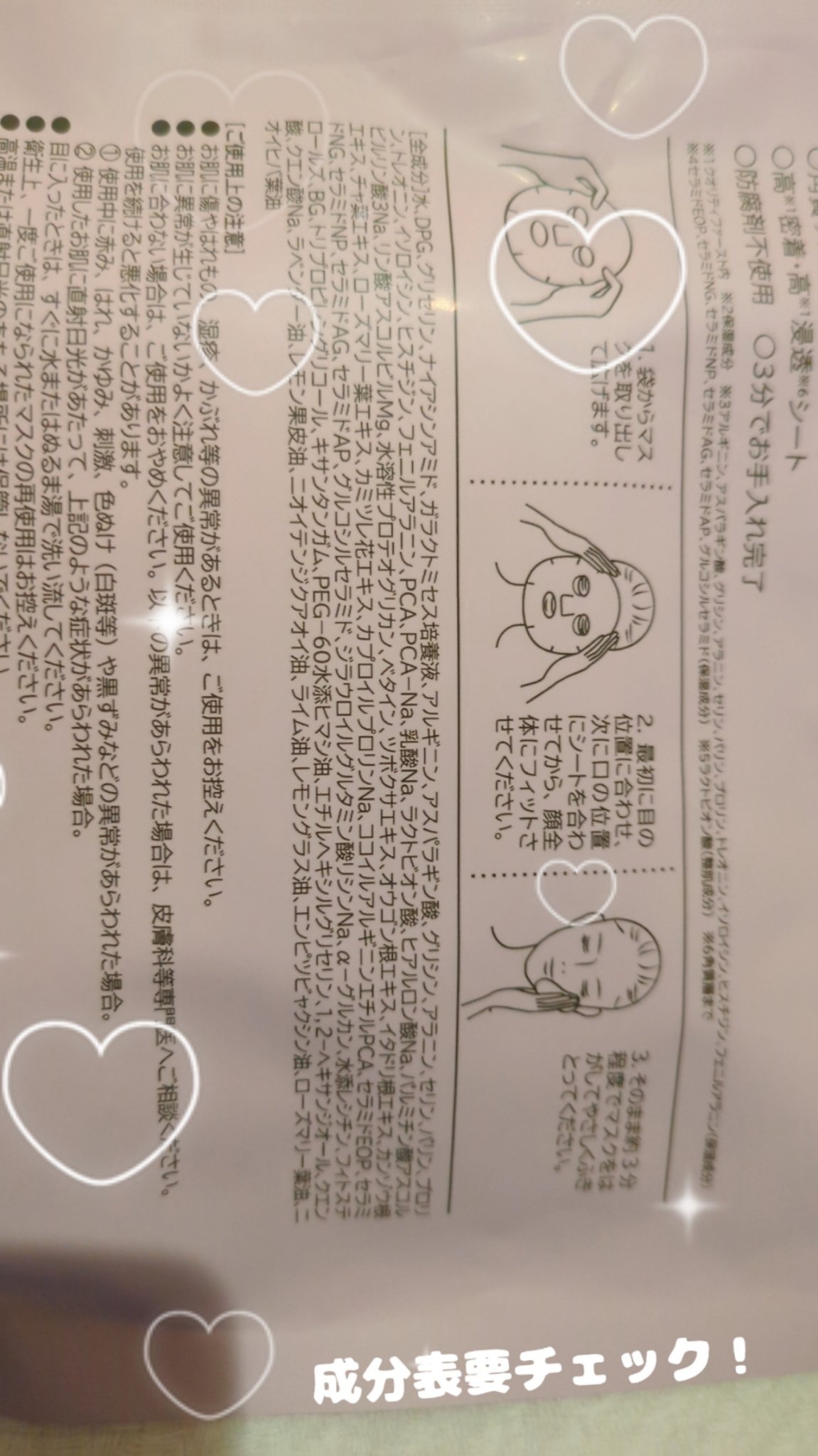 - <7枚> 水、DPG、グリセリン、ナイアシンアミド、ガラクトミセス培養液、アルギニン、アスパラギン酸、グリシン、アラニン、セリン、バリン、プロリン、トレオニン、イソロイシン、ヒスチジン、フェニルアラニン、PCA、PCA-Na、乳酸Na、ラクトビオン酸、ヒアルロン酸Na、パルミチン酸アスコルビルリン酸3Na、リン酸アスコルビルMg、水溶性プロテオグリカン、ベタイン、ツボクサエキス、オウゴン根エキス、イタドリ根エキス、カンゾウ根エキス、チャ葉エキス、ローズマリー葉エキス、カミツレ花エキス、カプロイルプロリンNa、ココイルアルギニンエチルPCA、セラミドEOP、セラミドNG、セラミドNP、セラミドAG、セラミドAP、グルコシルセラミド、ジラウロイルグルタミン酸リシンNa、α-グルカン、水添レシチン、フィトステロールズ、BG、トリプロピレングリコール、キサンタンガム、PEG-60水添ヒマシ油、エチルヘキシルグリセリン、1,2-ヘキサンジオール、クエン酸、クエン酸Na、ラベンダー油、レモン果皮油、ニオイテンジクアオイ油、ライム油、レモングラス油、エンピツビャクシン油、ローズマリー葉油、ニオイヒバ葉油 <30枚> 水、DPG、グリセリン、ナイアシンアミド、ガラクトミセス培養液、アルギニン、アスパラギン酸、グリシン、アラニン、セリン、バリン、プロリン、トレオニン、イソロイシン、ヒスチジン、フェニルアラニン、PCA、PCA-Na、乳酸Na、ラクトビオン酸、ヒアルロン酸Na、パルミチン酸アスコルビルリン酸3Na、リン酸アスコルビルMg、水溶性プロテオグリカン、ベタイン、ツボクサエキス、オウゴン根エキス、イタドリ根エキス、カンゾウ根エキス、チャ葉エキス、ローズマリー葉エキス、カミツレ花エキス、カプロイルプロリンNa、ココイルアルギニンエチルPCA、セラミドEOP、セラミドNG、セラミドNP、セラミドAG、セラミドAP、グルコシルセラミド、ジラウロイルグルタミン酸リシンNa、α-グルカン、水添レシチン、フィトステロールズ、BG、トリプロピレングリコール、キサンタンガム、PEG-60水添ヒマシ油、エチルヘキシルグリセリン、1,2-ヘキサンジオール、クエン酸、クエン酸Na、ラベンダー油、レモン果皮油、ニオイテンジクアオイ油、ライム油、レモングラス油、エンピツビャクシン油、ローズマリー葉油、ニオイヒバ葉油