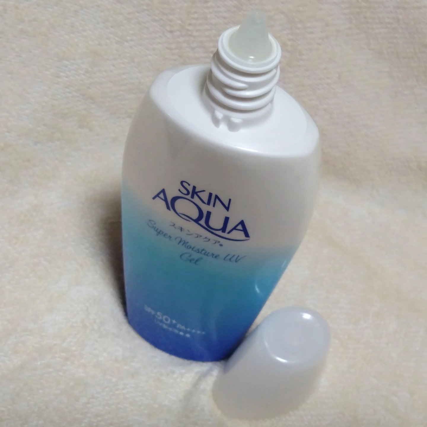 【スキンアクア】スーパーモイスチャージェルポンプタイプ購入しました。UV耐水性が書いてるので新しいバージョンかな?と思います。水のような軽いつけ心地で、ジェルタイプならではのうるおい感。顔にも身体にも使える万能UVで、SPF50+/PA+++...