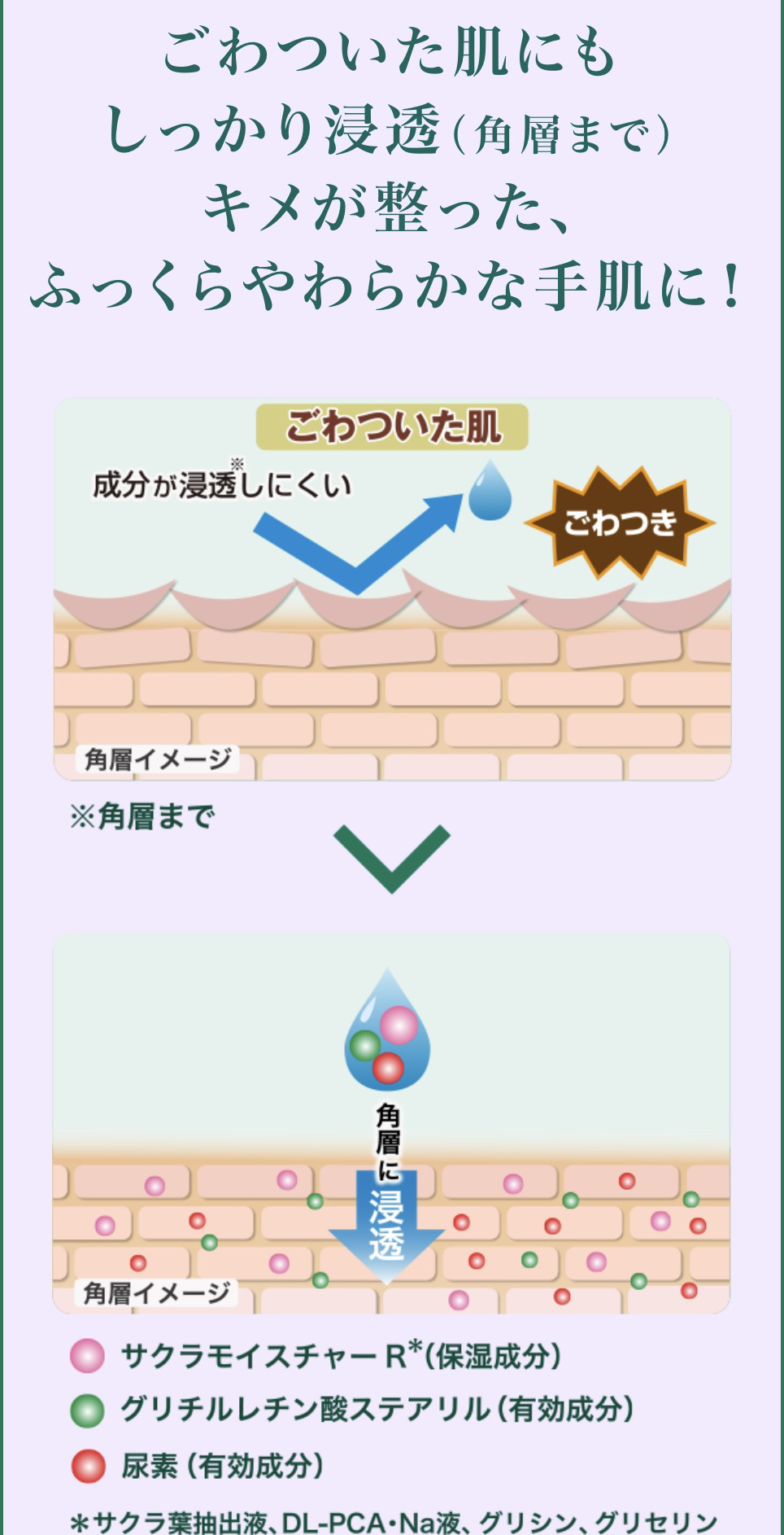 - 大人の贅沢保湿、プレミアムハンドケア。桜色のクリームが小じわを目立たせず、くすみを補正して明るい手肌に整えます(メーキャップ効果)。 保湿成分サクラモイスチャーα(ソメイヨシノ葉エキス、コラーゲン、ヒアルロン酸、グリセリン)配合。角層内部までうるおって、ハリ・つやを与えます。 UVカット成分配合で日やけによるシミ・そばかすを防ぎます(SPF20/PA+)。 うるおうのにべたつかない使用感。桜の香り。
