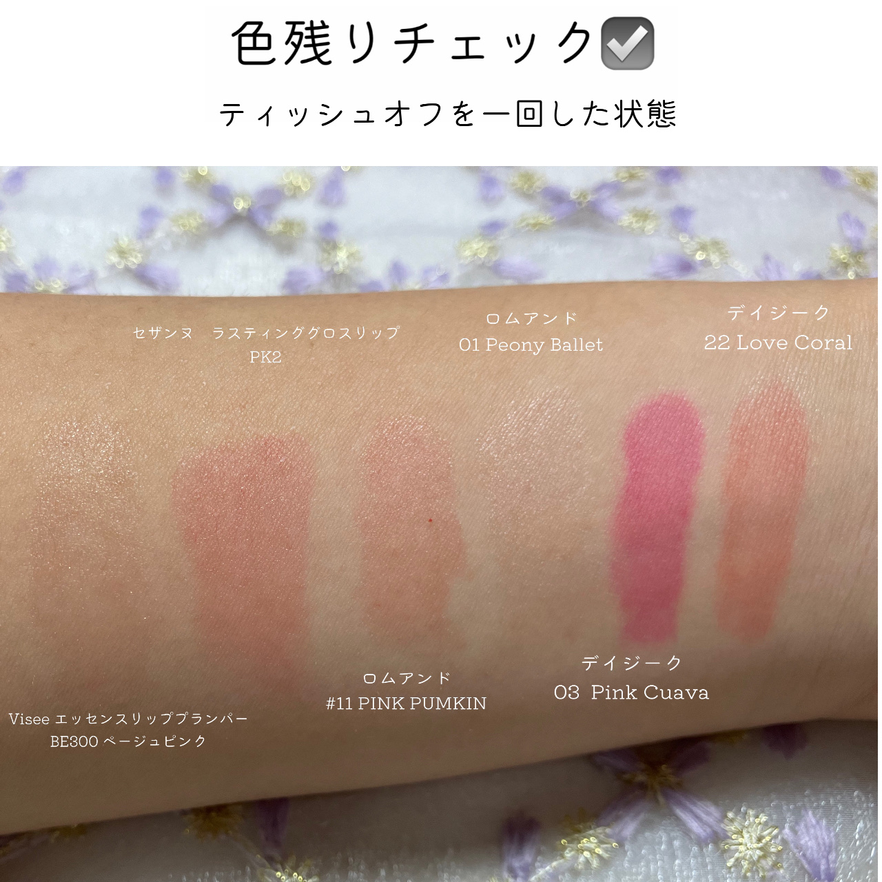 22 Love Coral このリップはコーラルピンクでオレンジ味があるので、イエベ春さんにぴったり! 唇が明るくなる感じがします! CEZANNE Lasting Gloss Lip PK2 ピンク系 なめらかでとても塗りやすく、ツヤ感がとても綺麗でお気に入り!🌷 保湿成分も入っていて潤います。 Visee エッセンスリッププランパー BE300 ページュピンク 一塗りでちゅるちゅるリップになってお気に入りの細かいゴールドラメが本当に可愛い!✨香りはバニラミントの香りでいい香リ🌱 肌馴染みがいいお色!