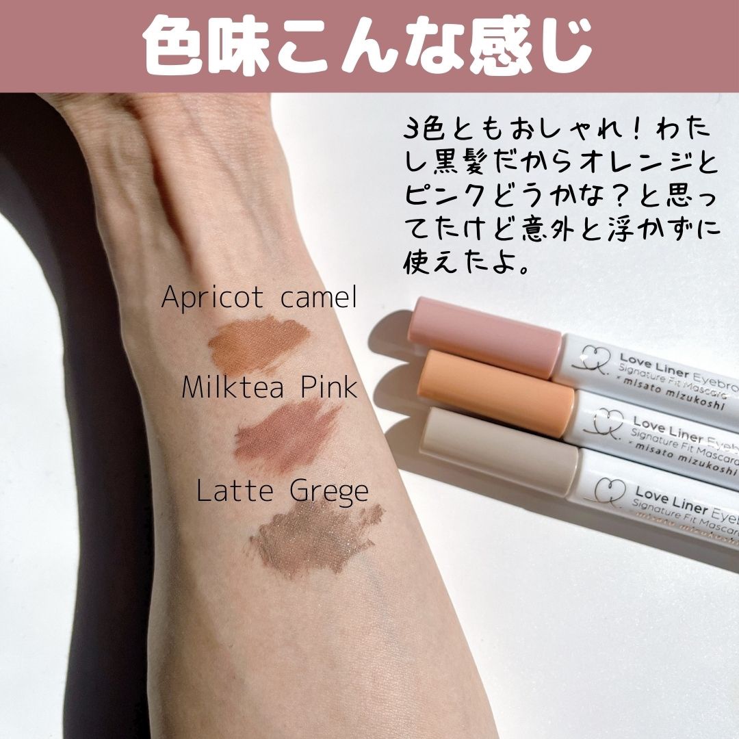 - 〈限定発売〉美容クリエイター水越みさとさん監修アイブロウマスカラ第2弾。 ・“眉の存在感を和らげる”ことをテーマに、春らしい絶妙なニュアンス感カラー。 ・地肌につきにくく塗りやすい角度つき極小ブラシ採用。 ・1本1本色づき自然になじむアイブロウマスカラ。 ミルクティピンク…温かみのある愛されピンクブラウン ラテグレージュ…ソフトな印象を与えるこなれグレーベージュ アプリコットキャメル…自然な抜け感が出るおしゃれオレンジブラウン