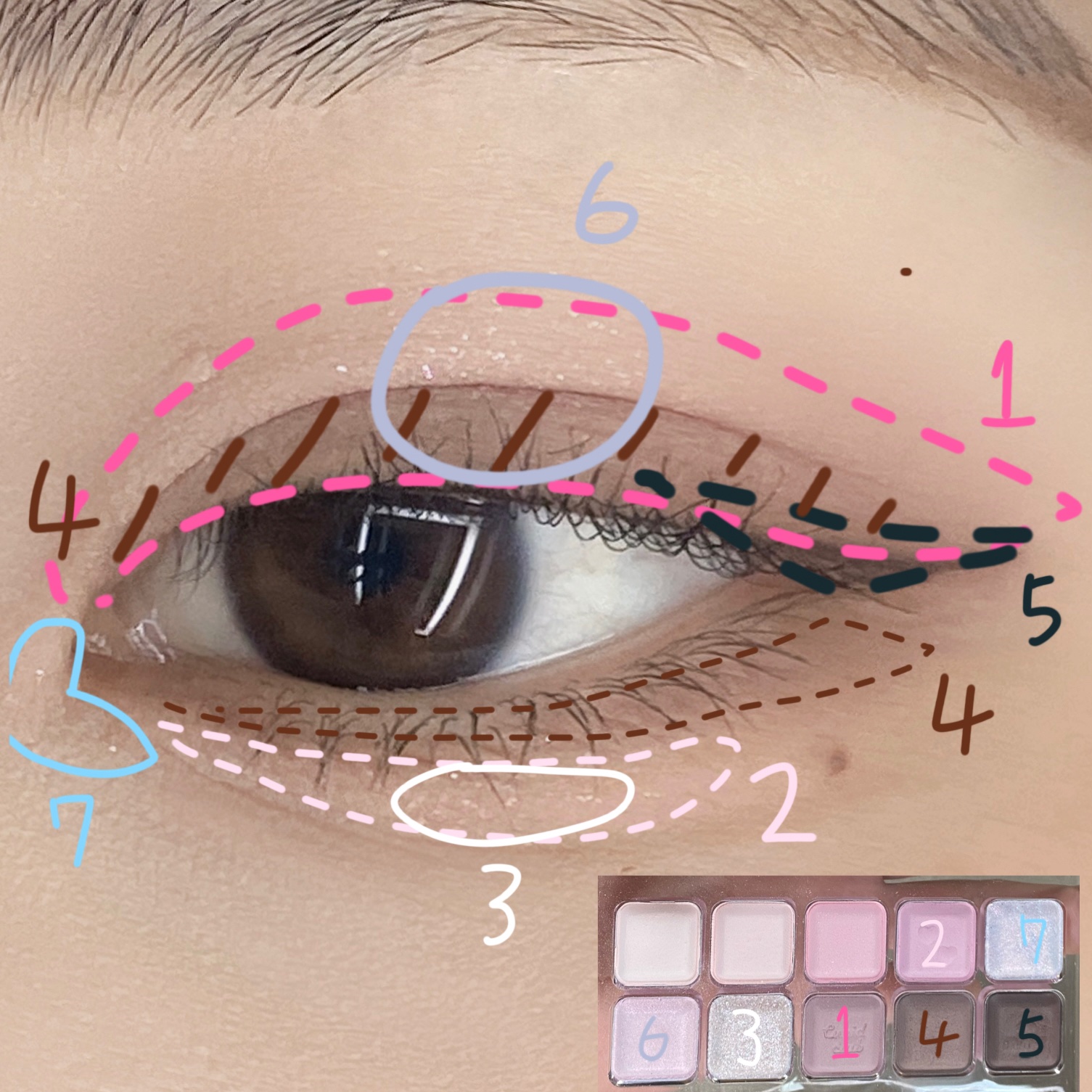 見たままの発色だけど薄づきで調節して塗りやすい🎨 そして全部のカラーが可愛すぎて捨て色がない( ; ; ) 左上の白っぽいカラーはハイライトとして使っても可愛いし盛れる💕 締め色はチョコカラーでアイラインぼかしたり三角ゾーンが綺麗に作れてアイメイクの完成度が上がる🤍 そして私が1番お気に入りのカラーがくすみピンク🌸 大人っぽいピンクメイクに仕上がるから最近毎日このカラー使ってる👀