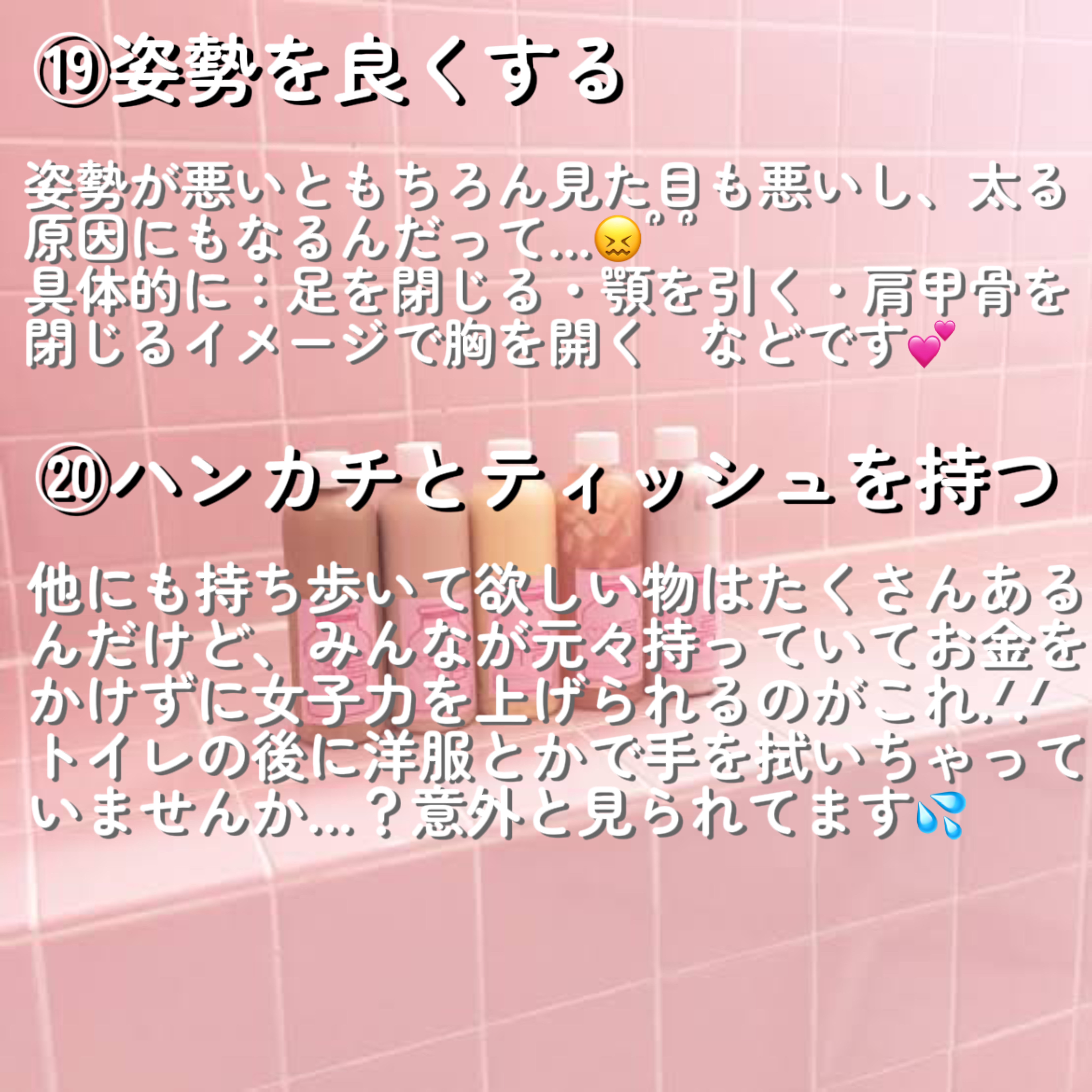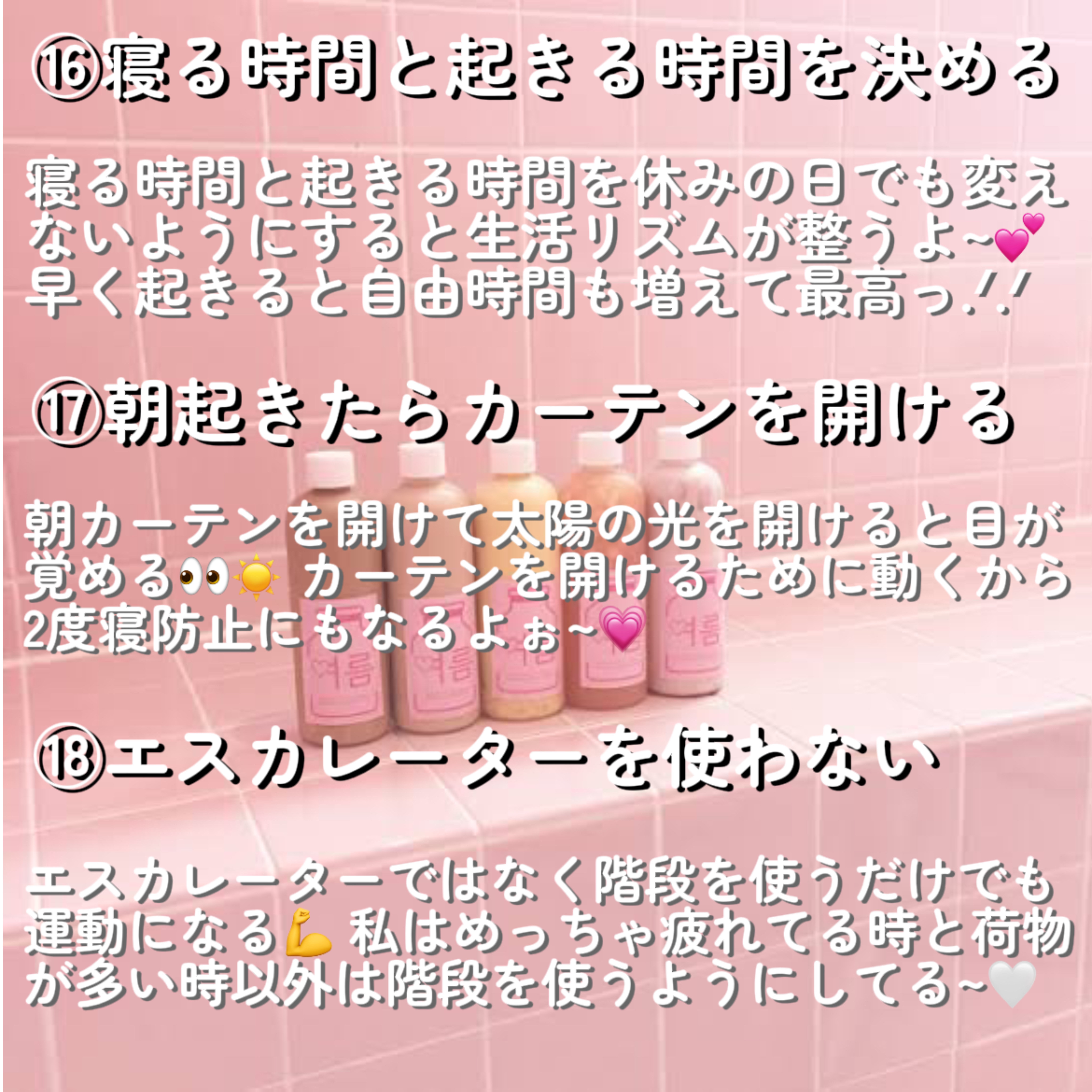 ããããã§ããŠã朰ããªã åãèããªã æ¯æ¥äœéèšã«ä¹ã æãšã颚ååŸã«ã¹ãã¬ããããã æ¯æ¥æ¹¯è¹ã«æµžãã ããããæ°Žã飲ã å¯ãæéãšèµ·ããæéãæ±ºãã æèµ·ããã1çªã«ã«ãŒãã³ãéãã ãšã¹ã«ã¬ãŒã¿ãŒã䜿ããªã å§¿å¢ãè¯ããã ãã³ã«ããšãã£ãã·ã¥ãæã¡æ©ã