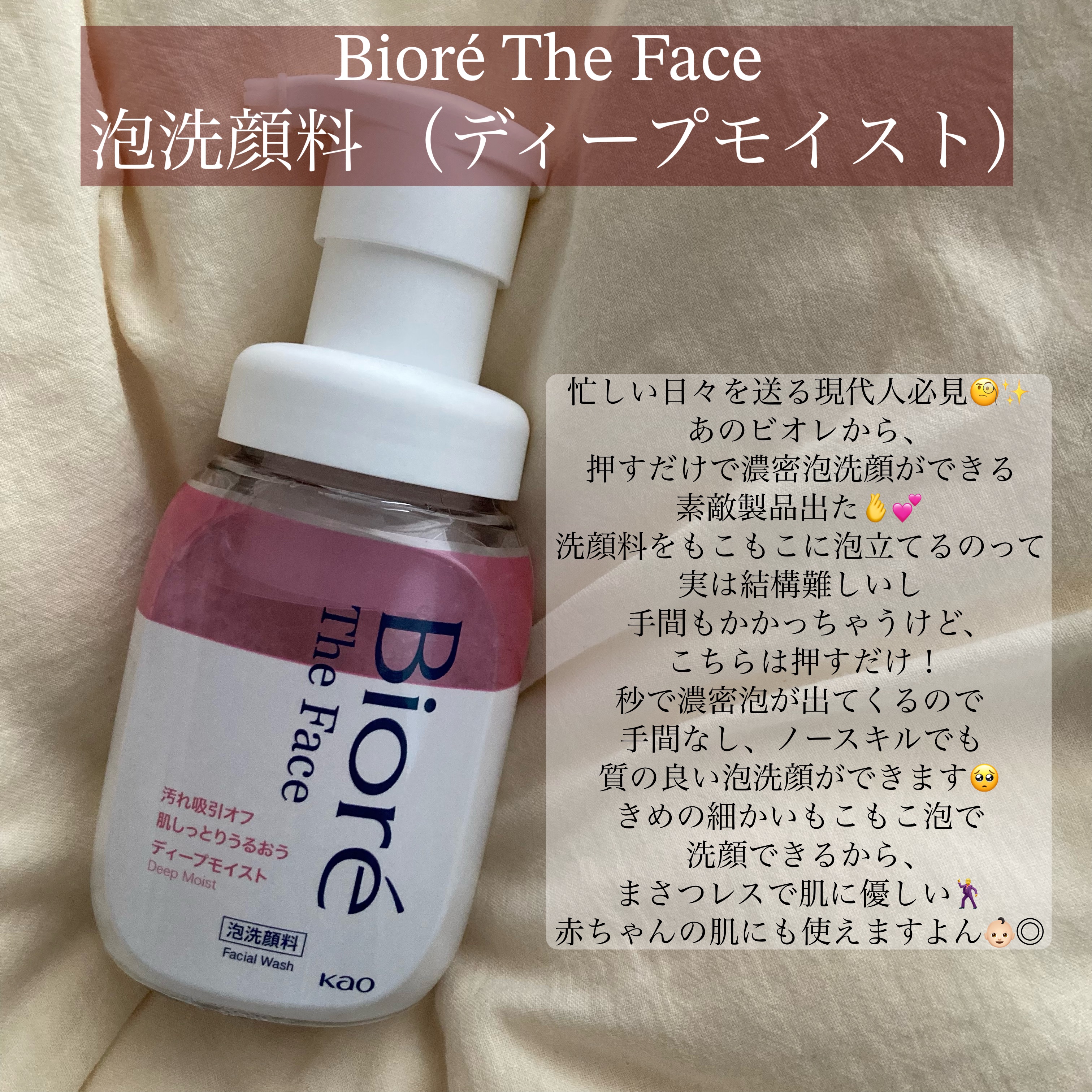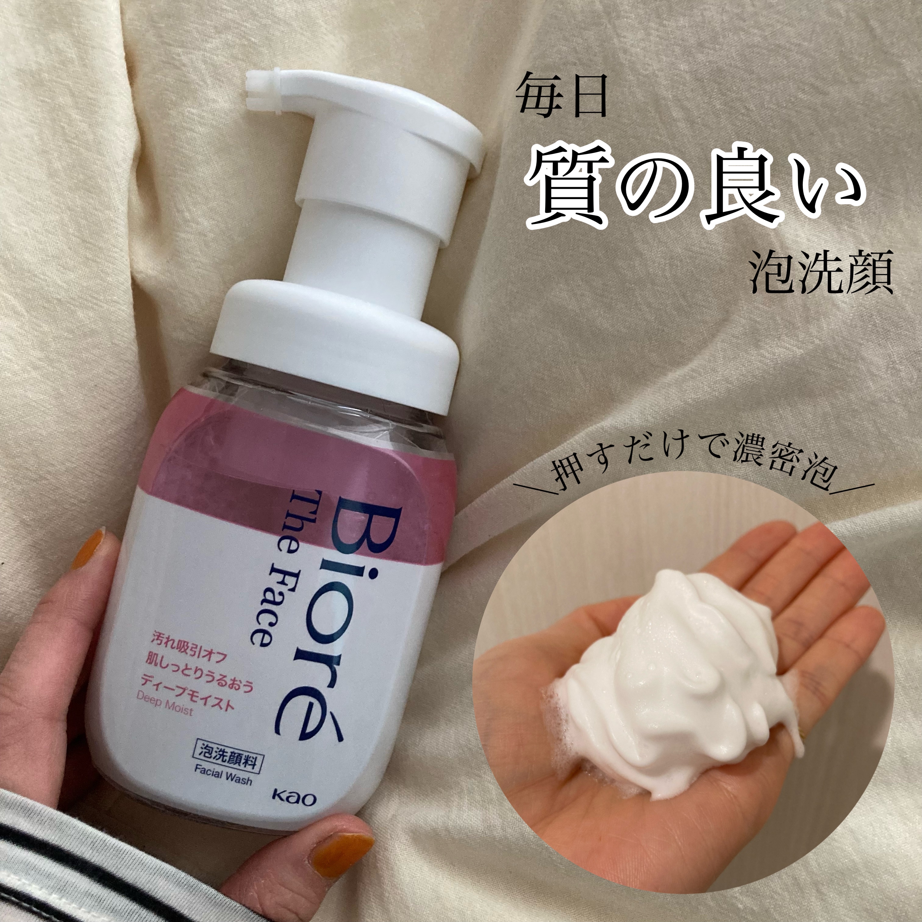 押すと、ホイップ泡で出てくる😍🧁ビオレTheフェイス泡洗顔料ディープモイスト🧁泡立てるのって、少し時間・手間がかかるよね🧼🫧これは泡立てなくて、そのまま使えて、便利🤩時短になるね!この泡がクリーミィーでなめらか☺️密着する生クリーム泡で、よご...