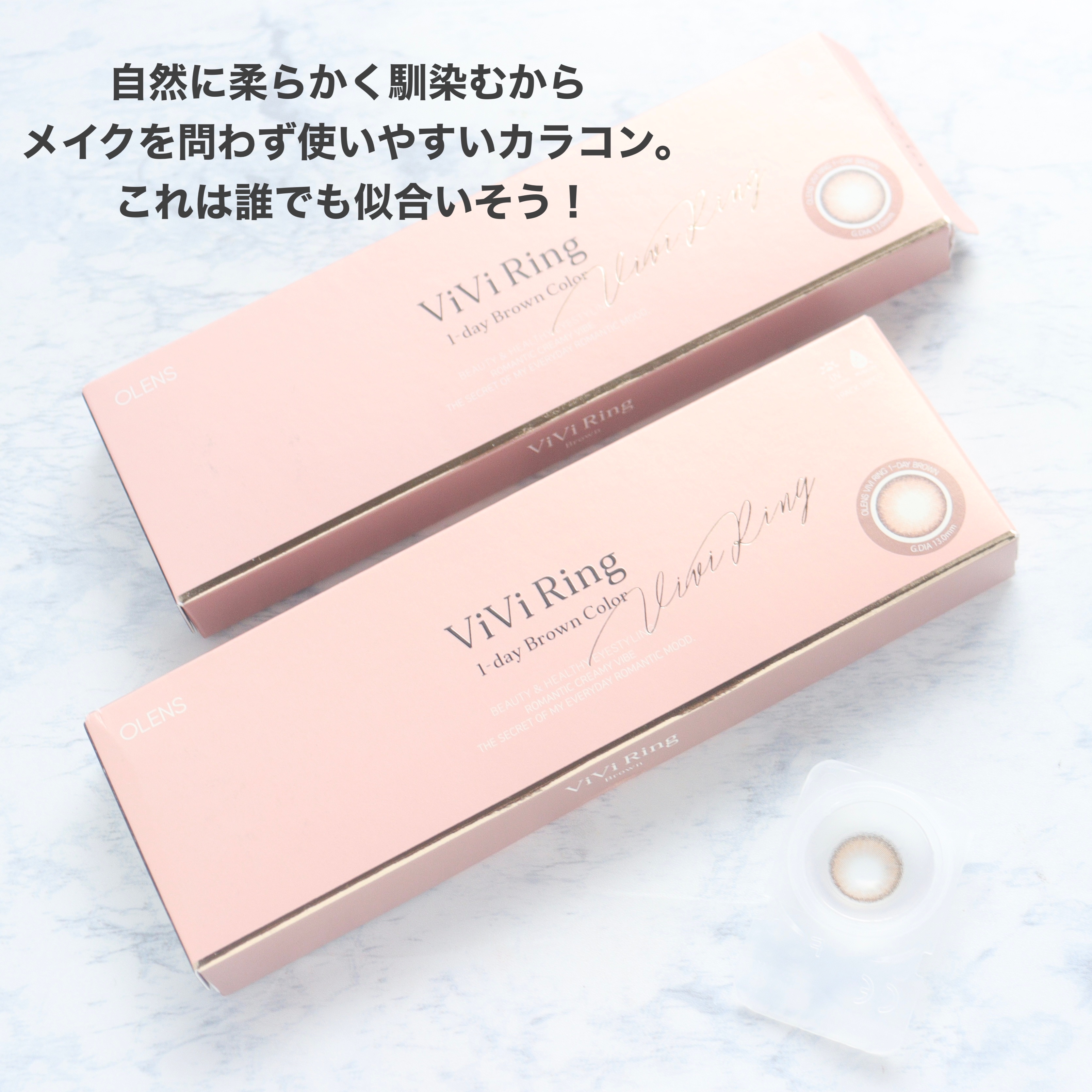 - ■OLENS ViVi Ring(オーレンズビビリング) 韓国カラコン業界の話題のブランド『OLENS(オーレンズ)』の日本正式承認商品シリーズ。世界中から注目を浴びるグループ「NewJeans (ニュージーンズ)」がイメージモデル。韓国でも長年大人気のベストセラーシリーズ*。くっきりめのぼかしフチと発色の良いミルクティーカラーが瞳にちゅるん感と透明感を演出してくれるカラコンです。ロマンチックな目元に。*当社ブランド内比較 ■使い方 コンタクトレンズは高度管理医療機器です。必ず眼科医の処方に従って購入してください。 ■使用上の留意事項 コンタクトレンズは高度管理医療機器です。眼科医の指導に従い装用期間を厳守し、正しくお使いください。眼の定期検査を必ず受けてください。添付文書を必ず読み、取扱方法、装用時間を守って正しくお使いください。少しでも異常を感じたら、直ちに眼科医の検査を受けてください。